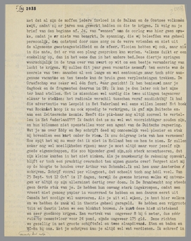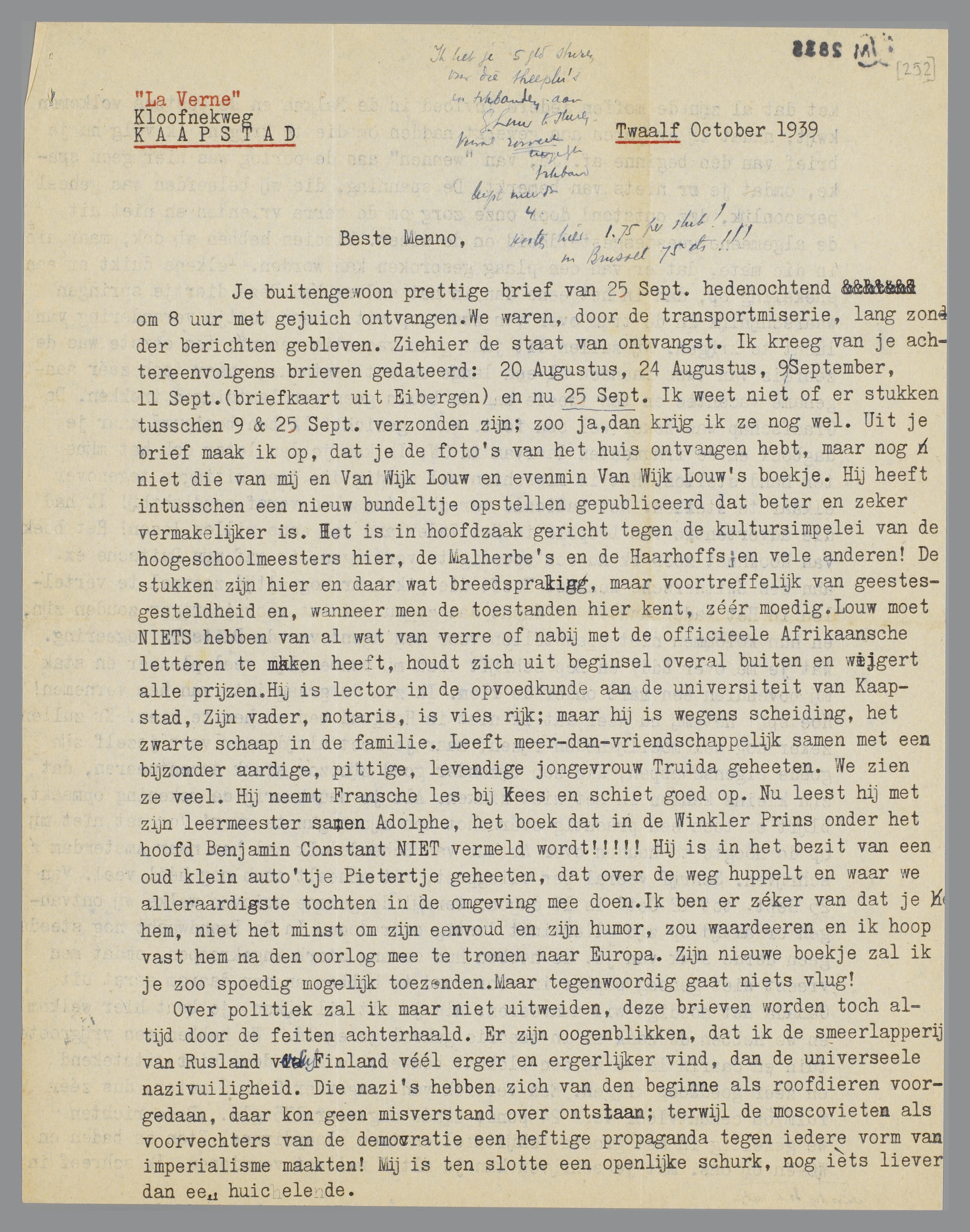 Je buitengewoon prettige brief van 25 Sept. hedenochtend om 8 uur met gejuich ontvangen. We waren, door de transportmiserie, lang zonder berichten gebleven. Ziehier de staat van ontvangst. Ik kreeg van je achtereenvolgens brieven gedateerd: 20 Augustus, 24 Augustus, 9 September, 11 Sept. (brief uit Eibergen) en nu 25 Sept. Ik weet niet of er stukken tusschen 9 & 25 Sept. verzonden zijn; zoo ja, dan krijg ik ze nog wel. Uit je brief maak ik op, dat je de foto's van het huis ontvangen hebt, maar nog niet die van mij en Van Wijk Louw en evenmin Van Wijk Louw's boekje. Hij heeft intusschen een nieuw bundeltje opstellen gepubliceerd dat beter en zeker vermakelijker is. Het is in hoofdzaak gericht tegen de kultursimpelei van de hoogeschoolmeesters hier, de Malherbe's en de Haarhoffs; en vele anderen! De stukken zijn hier en daar wat breedsprakig, maar voortreffelijk van geestesgesteldheid en, wanneer men de toestanden hier kent, zéér moedig. Louw moet NIETS hebben van al wat van verre of nabij met de officieele Afrikaansche letteren te maken heeft, houdt zich uit beginsel overal buiten en weigert alle prijzen. Hij is lector in de opvoedkunde aan de universiteit van Kaapstad, Zijn vader, notaris, is vies rijk; maar hij is wegens scheiding, het zwarte schaap in de familie. Leeft meer-dan-vriendschappelijk samen met een bijzonder aardige, pittige, levendige vrouw Truida geheeten. We zien ze veel. Hij neemt Fransche les bij Kees en schiet goed op. Nu leest hij met zijn leermeester samen Adolphe, het boek dat in de Winkler Prins onder de kop Benjamin Constant NIET vermeld wordt!!!!! Hij is in het bezit van een oud klein auto'tje Pietertje geheeten, dat over de weg huppelt en waar we alleraardigste tochten in de omgeving mee doen. Ik ben er zéker van dat je hem, niet in het minst om zijn eenvoud en zijn humor, zou waarderen en ik hoop vast hem na den oorlog mee te tronen naar Europa. Zijn nieuwe boekje zal ik je zoo spoedig mogelijk toezenden. Maar tegenwoordig gaat niets vlug!