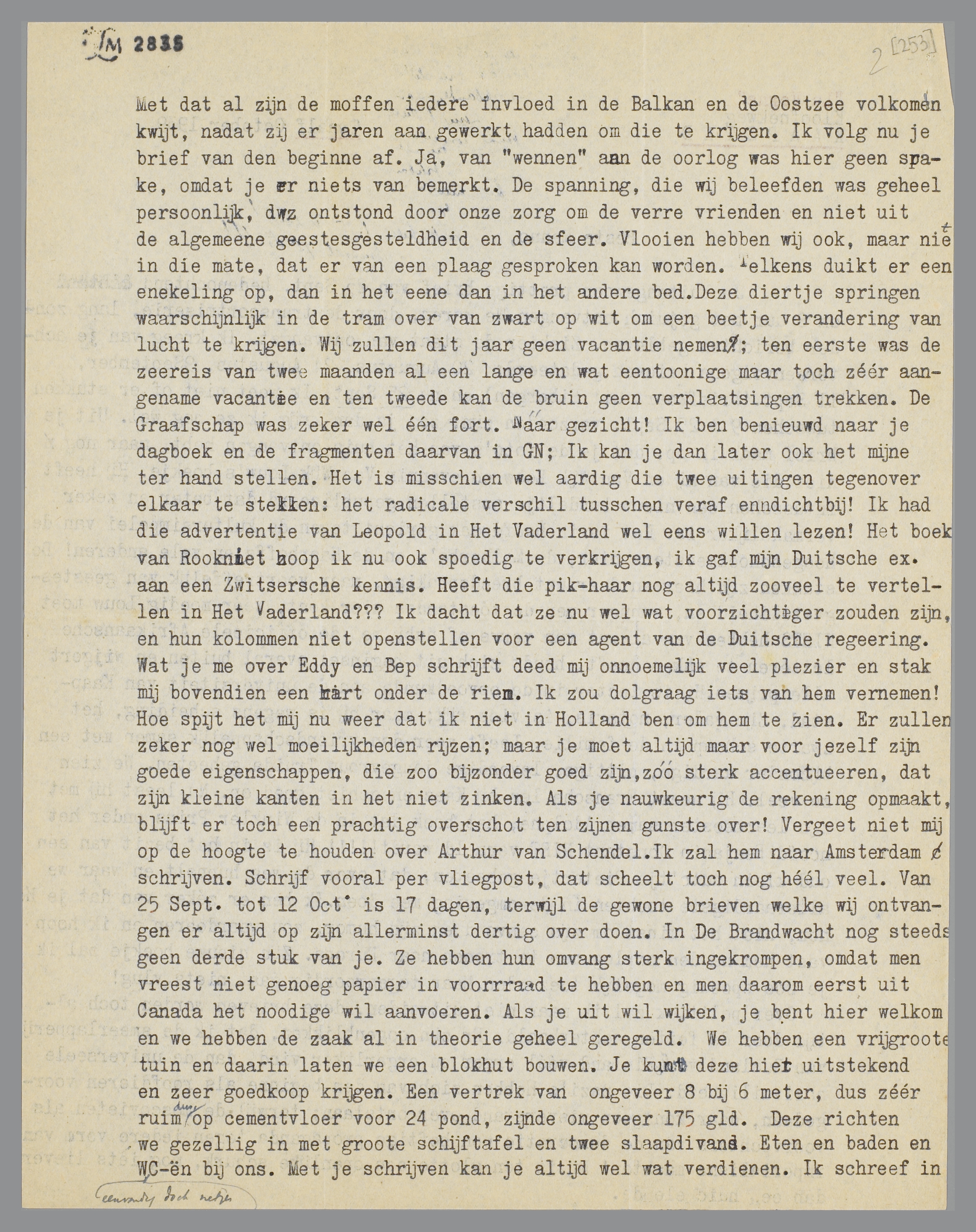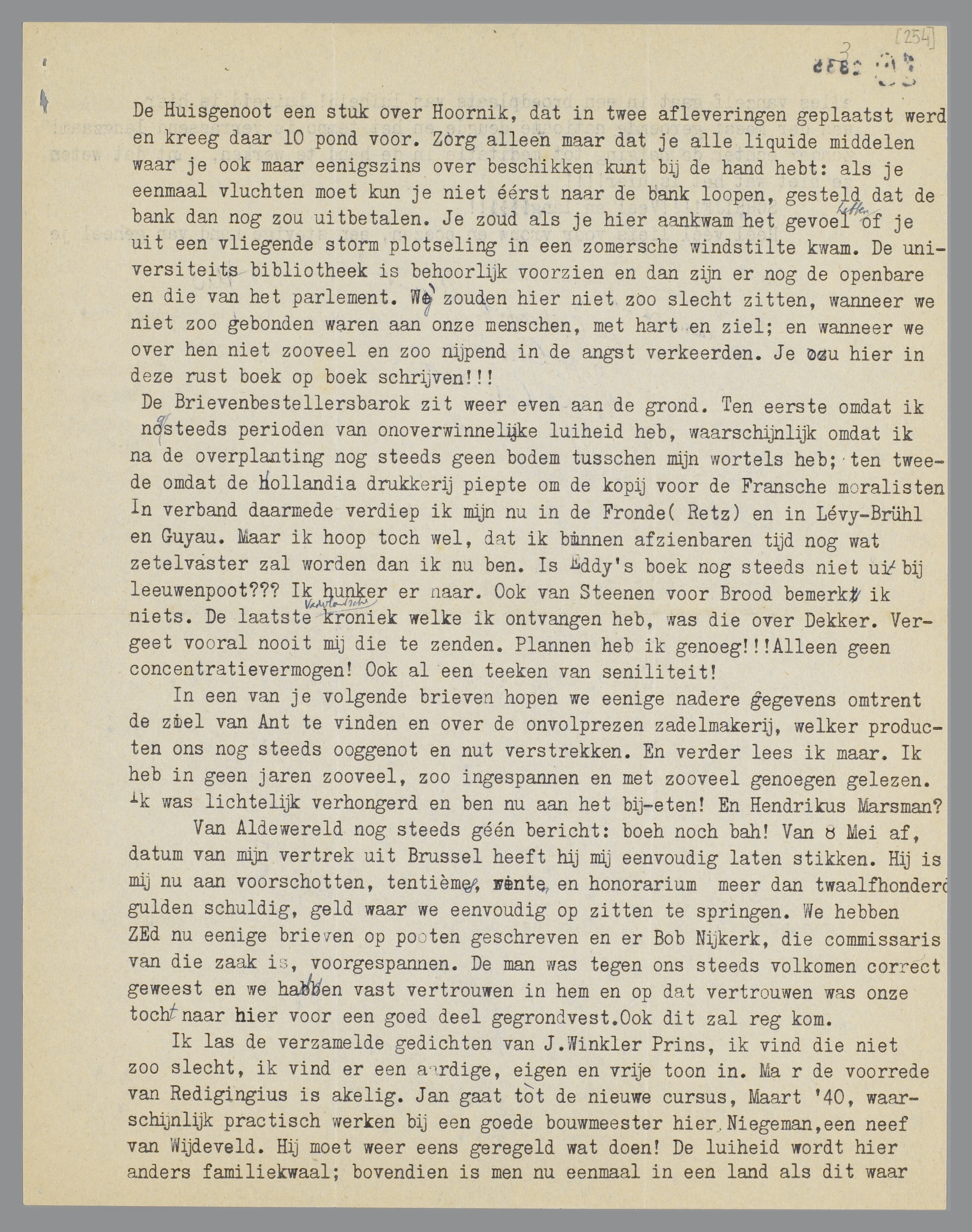 Met dat al zijn de moffen iedere invloed in de Balkan en de Oostzee volkomen kwijt, nadat zij er jaren aan gewerkt hadden om die te krijgen. Ik volg nu je brief van den beginne af. Ja, van ‘wennen’ aan de oorlog was hier geen sprake, omdat je er niets van bemerkt. De spanning, die wij beleefden was geheel persoonlijk, dwz ontstond door onze zorg om de verre vrienden en niet uit de algemeene geestesgesteldheid en de sfeer. Vlooien hebben wij ook, maar niet in die mate, dat er van een plaag gesproken kan worden. Telkens duikt er een enkeling op, dan in het eene dan in het andere bed. Deze diertjes springen waarschijnlijk in de tram van zwart op wit om een beetje verandering van lucht te krijgen. Wij zullen dit jaar geen vacantie nemen; ten eerste was de zeereis van twee maanden al een lange en wat eentoonige maar toch zéér aangename vacantie en ten tweede kan de bruin geen verplaatsingen trekken. De Graafschap was zeker wel één fort. Náár gezicht. Ik ben benieuwd naar je dagboek en de fragmenten daarvan in GN; Ik kan je dan later ook het mijne ter hand stellen. Het is misschien wel aardig die twee uitingen tegenover elkaar te stellen: het radicale verschil tusschen veraf en dichtbij! Ik had die advertentie van Leopold in Het Vaderland wel eens willen lezen! Het boek van Rookniet hoop ik nu ook spoedig te verkrijgen, ik gaf mijn Duitsche ex. aan een Zwitsersche kennis. Heeft die pik-haar nog altijd zooveel te vertellen in Het Vaderland??? Ik dacht dat ze nu wel wat voorzichtiger zouden zijn, en hun kolommen niet openstellen voor een agent van de Duitsche regeering. Wat je mij over Eddy en Bep schrijft doet mij onnoemelijk veel plezier en stak mij bovendien een hart onder de riem. Ik zou dolgraag iets van hem vernemen! Hoe spijt het mij nu weer dat ik niet in Holland ben om hem te zien. Er zullen zeker nog wel moeilijkheden rijzen; maar je moet altijd maar voor jezelf zijn goede eigenschappen, die zoo bijzonder goed zijn, zóó sterk accentueeren, dat zijn kleine kanten in het niet zinken. Als je nauwkeurig de rekening opmaakt, blijft er toch een prachtig overschot ten zijnen gunste over! Vergeet niet mij op de hoogte te houden over Arthur van Schendel. Ik zal hem naar Amsterdam schrijven. Schrijf vooral per vliegpost, dat scheelt toch nog héél veel. Van 25 Sept. tot 12 Oct. is 17 dagen, terwijl de gewone brieven welke wij ontvangen er altijd op zijn minst dertig over doen. In De Brandwacht nog steeds geen derde stuk van je. Ze hebben hun omvang sterk ingekrompen, omdat men vreest niet genoeg papier in voorraad te hebben en men daarom eerst uit Canada het noodige wil aanvoeren. Als je uit wil wijken, je bent hier welkom en we hebben de zaak al in theorie geheel geregeld. We hebben een vrij groote tuin en daarin laten we een blokhut bouwen. Je kunt deze hier uitstekend en zeer goedkoop krijgen. Een vertrek van ongeveer 8 bij 6 meter, dus zéér ruim dus, op cementvloer van 24 pond, zijnde ongeveer 175 gld. Deze richten we gezellig in met groote schrijftafel en twee slaapdivans. Eten en baden en WC-ën <eenvoudig doch netjes> bij ons. Met je schrijven kan je altijd wel wat verdienen. Ik schreef in De Huisgenoot een stuk over Hoornik, dat in twee afleveringen geplaatst werd, en kreeg daar 10 pond voor. Zorg alleen maar dat je alle liquide middelen waar je ook maar eenigszins over kunt beschikken bij de hand hebt: als je eenmaal vluchten moet kun je niet éérst naar de bank loopen, gesteld dat de bank dan nog zou uitbetalen. Je zoud als je hier aankwam het gevoel hebben of je uit een vliegende storm plotseling in een zomersche windstilte kwam. De universiteits biblitheek is behoorlijk voorzien en dan zijn er nog de openbare en die van het parlement. We zouden hier niet zoo slecht zitten, wanneer we niet zoo gebonden waren aan onze menschen, met hart en ziel; en wanneer we over hen niet zooveel en zoo nijpend in angst verkeerden. Je zou hier in deze rust boek op boek schrijven!!!