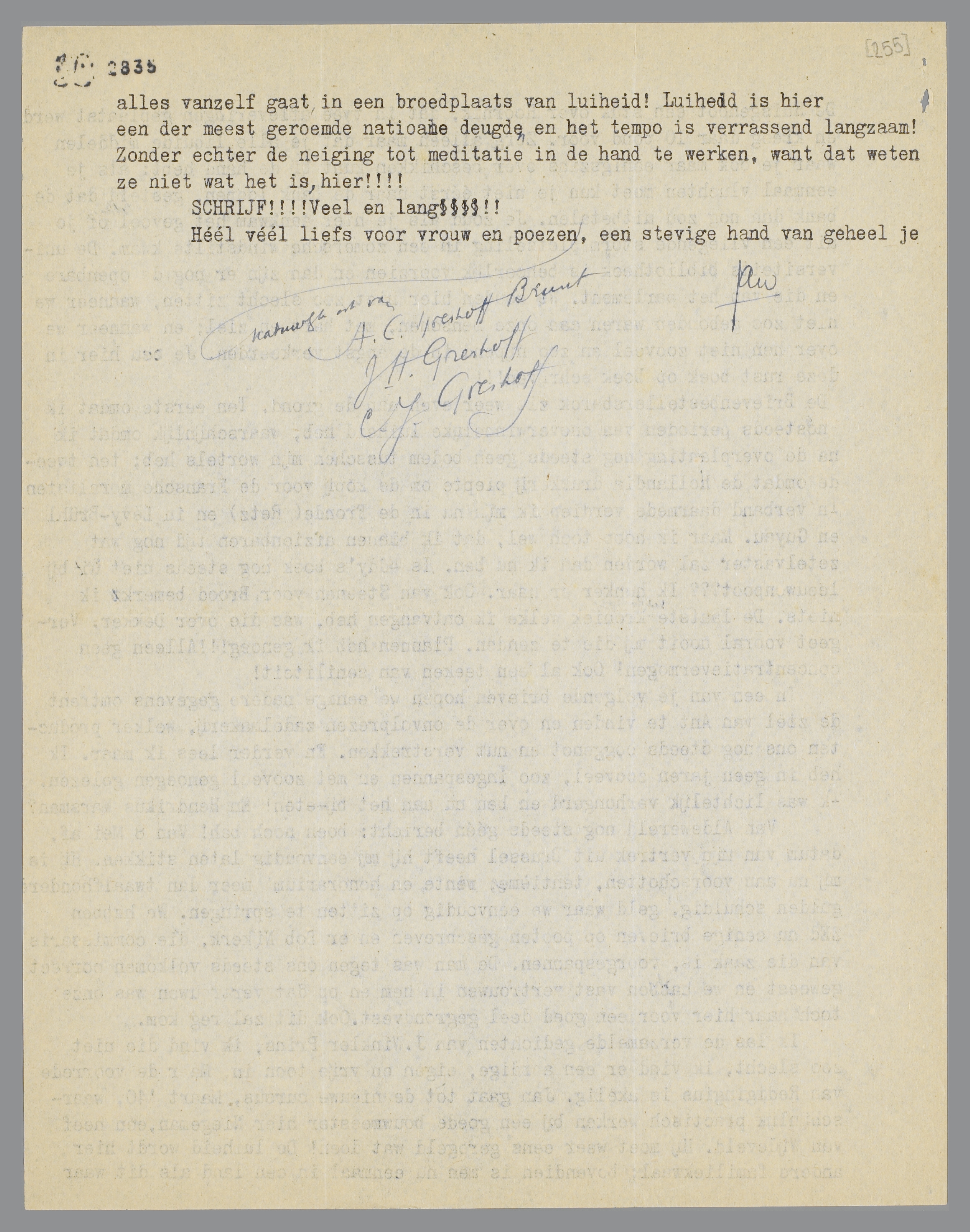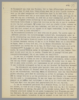 De brievenbestellersbarok zit weer even aan de grond. Ten eerste omdat ik nog steeds perioden van onoverwinnelijke luiheid heb, waarschijnlijk omdat ik na de overplanting nog steeds geen bodem tusschen mijn wortels heb; ten tweede omdat de Hollandia drukkerij piepte om de kopij voor de Fransche moralisten. In verband daarmede verdiep ik mij nu in de Fronde (Retz) en in Lévy-Brühl en Guyau. Maar ik hoop toch wel, dat ik binnen afzienbaren tijd nog wat zetelvaster zal worden dan ik nu ben. Is Eddy's boek nog steeds niet uit bij leeuwenpoot??? Ik hunker er naar. Ook van Stenen voor Brood bemerk ik niets. De laatste kroniek welke ik ontvangen heb, was die over Dekker. Vergeet vooral nooit mij die te zenden. Plannen heb ik genoeg!!! Alleen geen concentratievermogen! Ook al een teeken van seniliteit!