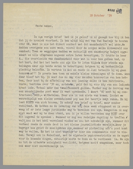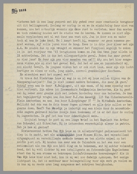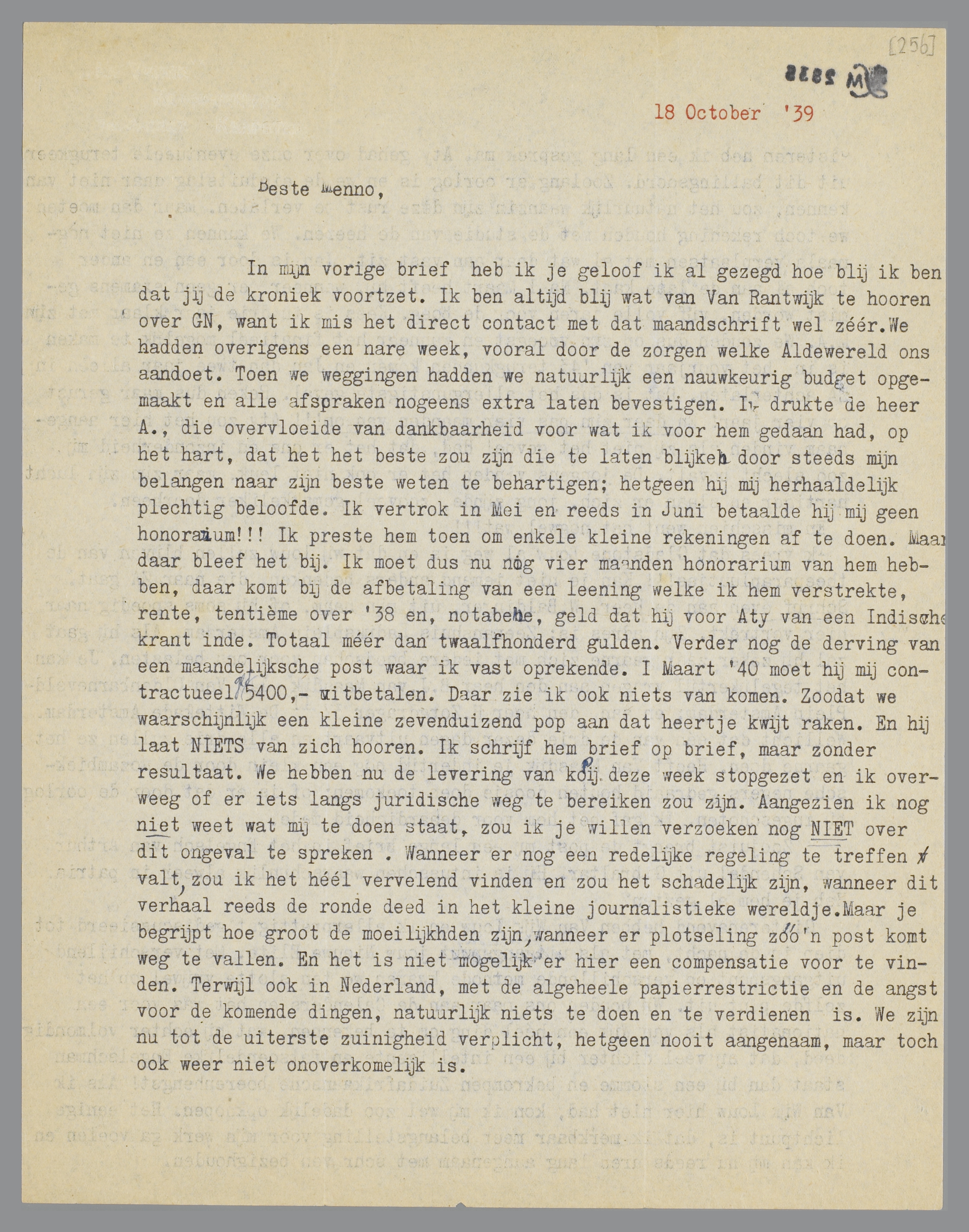 In mijn vorige brief heb ik je geloof ik al gezegd hoe blij ik ben dat jij de kroniek voortzet. Ik ben altijd blij wat van Van Rantwijk te hooren over GN, want ik mis het direct contact met dat maandschrift wel zéér. We hadden overigens een nare week, vooral door de zorgen welke Aldewereld ons aandoet. Toen we weggingen hadden we natuurlijk een nauwkeurig budget opgemaakt en alle afspraken nogeens extra laten bevestigen. Ik drukte de heer A., die overvloeide van dankbaarheid voor wat ik voor hem gedaan had, op het hart, dat het het beste zou zijn die te laten blijken door steeds mijn belangen naar zijn beste weten te behartigen; hetgeen hij mij herhaaldelijk plechtig beloofde. Ik vertrok in Mei en reeds in Juni betaalde hij mij geen honorarium!!! Ik preste hem toen om enkele kleine rekeningen af te doen. Maar daar bleef het bij. Ik moet dus nu nog vier maanden honorarium van hem hebben, daar komt bij de afbetaling van een leening welke ik hem verstrekte, rente, tentième over '38 en, notabene, geld dat hij voor Aty van een Indische krant inde. Totaal méér dan twaalfhonderd gulden. Verder nog de derving van een maandelijksche post waar ik vast op rekende. 1 Maart '40 moet hij mij contractueel gld. 5400,- uitbetalen. Daar zie ik ook niets van komen. Zoodat we waarschijnlijk een kleine zevenduizend pop aan dat heertje kwijtraken. En hij laat NIETS van zich hooren. Ik schrijf hem brief op brief, maar zonder resultaat. We hebben nu de levering van kopij deze week stopgezet en ik overweeg of er iets langs juridische weg te bereiken zou zijn. Aangezien ik nog niet weet wat mij te doen staat, zou ik je willen verzoeken nog NIET over dit ongeval te spreken. Wanneer er nog een redelijke regeling te treffen valt, zou ik het héél vervelend vinden en zou het schadelijk zijn, wanneer dit verhaal reeds de ronde deed in het kleine journalistieke wereldje. Maar je begrijpt hoe groot de moeilijkheden zijn, wanneer er plotseling zóó'n post komt weg te vallen. En het is niet mogelijk er hier een compensatie voor te vinden. Terwijl ook in Nederland, met de algeheele papierrestrictie en de angst voor de komende dingen, natuurlijk niets te doen en te verdienen is. We zijn nu tot de uiterste zuinigheid verplicht, hetgeen nooit aangenaam, maar toch ook weer niet onoverkomelijk is.