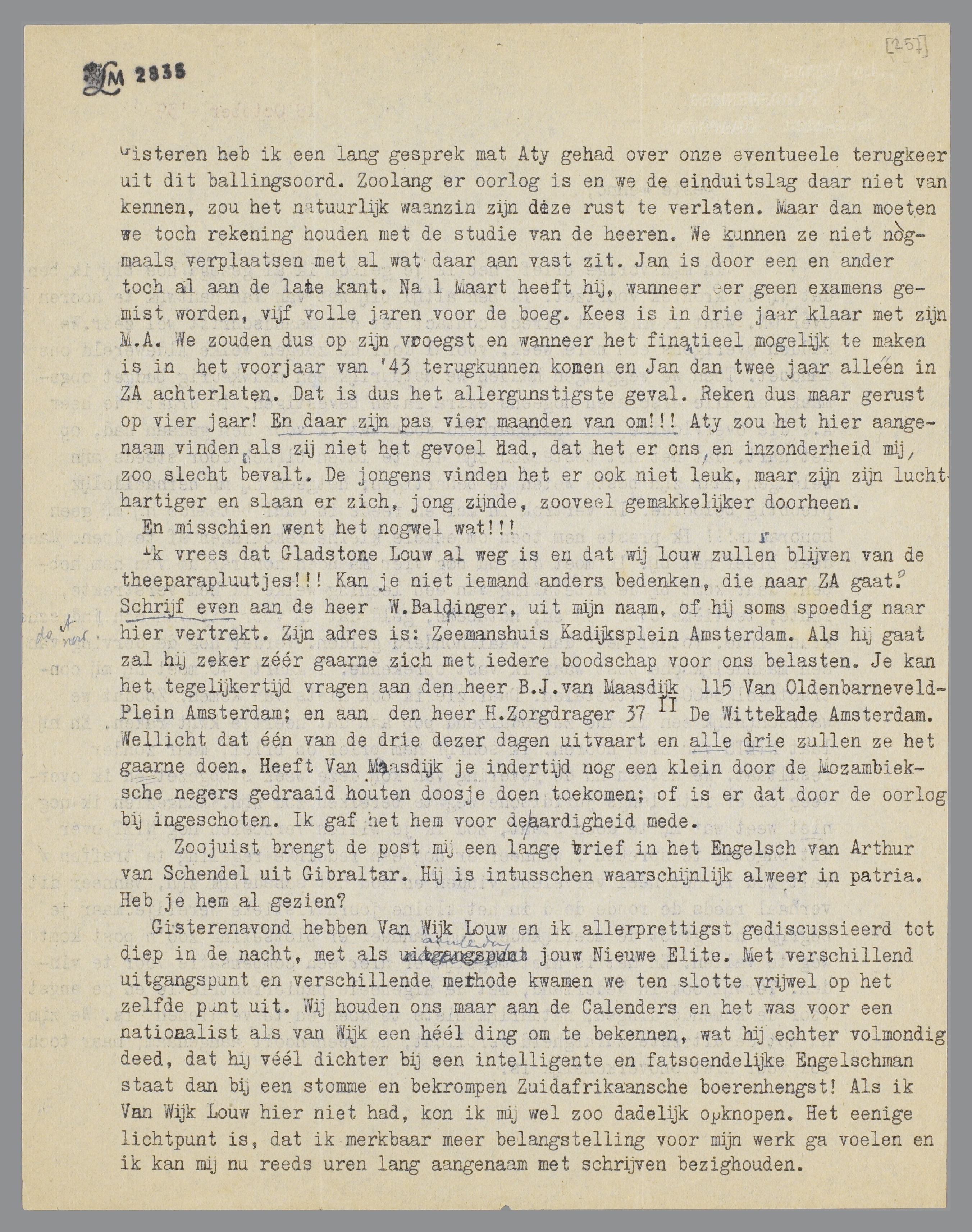 Ik vrees dat Gladstone Louw al weg is en dat wij louw zullen blijven van de theeparapluutjes!!! Kan je niet iemand anders bedenken, die naar ZA gaat? Schrijf even <do it now!> aan de heer W Baldinger, uit mijn naam, of hij soms spoedig naar hier vertrekt. Zij adres is: Zeemanshuis Kadijksplein Amsterdam. Als hij gaat zal hij zeker zéér gaarne zich met iedere boodschap voor ons belasten. Je kan het tegelijkertijd vragen aan den heer B.J. van Maasdijk 115 Van Oldenbarneveldplein Amsterdam; en aan den heer H. Zorgdrager 37II De Wittekade Amsterdam. Wellicht dat één van de drie dezer dagen uitvaart en alle drie zullen ze het gaarne doen. Heeft Van Maasdijk je indertijd nog een klein door de Mozambieksche negers gedraaid houten doosje doen toekomen; of is er dat door de oorlog bij ingeschoten. Ik gaf het hem voor de aardigheid mede.