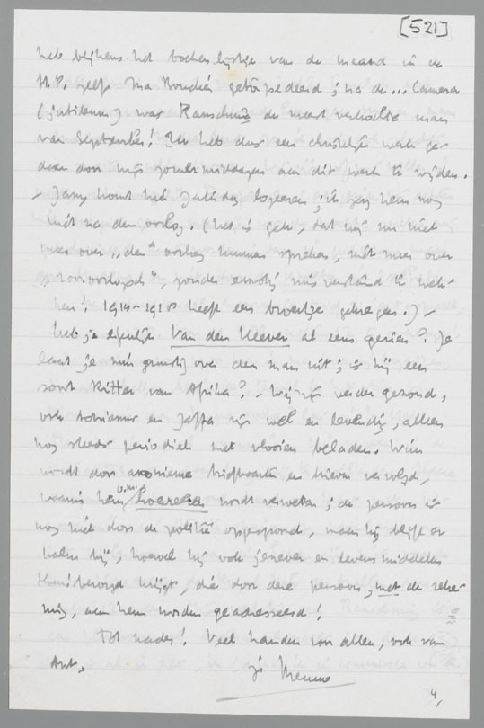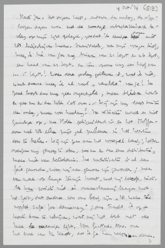 Wij zijn nog steeds buiten den oorlog, maar voor hoelang? De situatie wordt er niet gunstiger op, nu Polen geliquideerd is en het Moffendom wel tot elken prijs zal probeeren in het Westen door te breken. Wij zijn pas aan het voorspel bezig; hebben overigens nog genoeg te eten, zoo nu en dan eens distributie, maar niet van beteekenis. De mobilisatie is al een feit geworden, waar wij aan gewoon zijn geworden; maar van werk op langer termijn komt, wat mij betreft, niets. Ik kan zooiets niet in overeenstemming brengen met het feit, dat anderen voor ons bezig zijn ‘to make the world safe for democracy’; dus tracht ik op de korte baan te schrijven, wat mij het best met die taak te vereenigen lijkt. Voor Gr. Ned. Nov. over het boek van De Kadt, dat ik je kan recommandeeren.