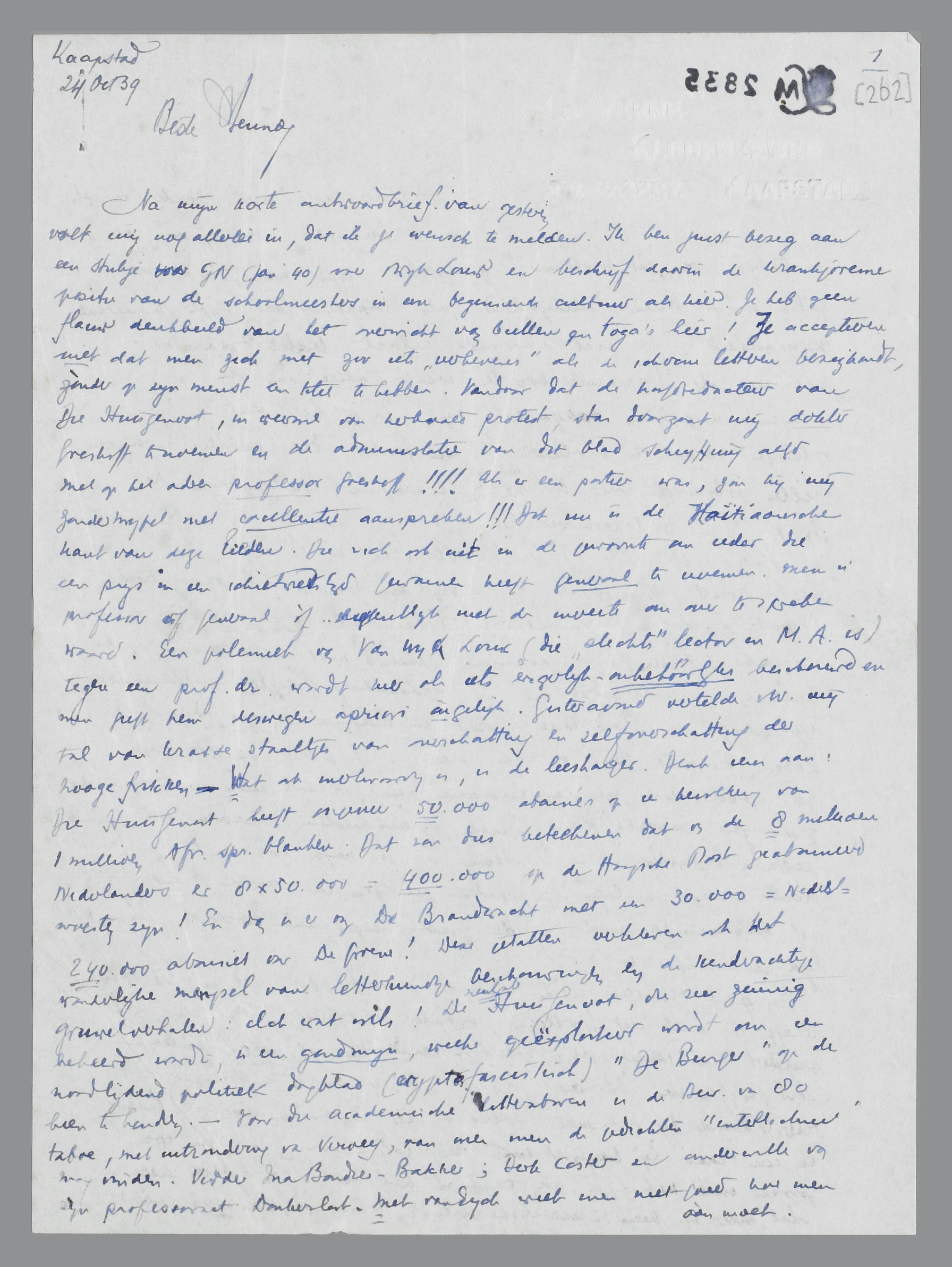 Na mijn korte antwoordbrief van gisteren valt mij nog allerlei in, dat ik je wensch te melden. Ik ben juist bezig aan een stukje voor GN (Jan '40) over v.Wijk Louw en beschrijf daarin de krankjoreme positie van de schoolmeesters in een beginnende cultuur als hier. Je heb geen flauw denkbeeld van het overwicht van bullen en toga's hier! Ze accepteeren niet dat men zich met zoo iets ‘verhevens’ als de schoone letteren bezighoudt, zónder op zijn minst een titel te hebben. Vandaar dat de hoofdredacteur van Die Huisgenoot, in weerwil van herhaald protest, star doorgaat mij dokter Greshoff te noemen en de administratie van dit blad schrijft mij altijd met op het adres professor Greshoff!!!! Als er een portier was, zou hij mij ongetwijfeld met excellentie aanspreken!!! Dit nu is de Haïtiaansche kant van deze lieden, die zich ook uit in de gewoonte om ieder die een prijs in een schietwedstrijd gewonnen heeft, generaal te noemen. Men is professor of generaal óf... eigentlijk niet de moeite om over te spreken waard. Een polemiek van Van Wijk Louw (die ‘slechts’ lector en M.A. is) tegen een prof. dr. wordt hier als iets ergelijk-onbehóórlijks beschouwd en men geeft hem deswegen apriori on gelijk. Gisteravond vertelde v.W. mij tal van krasse staaltjes van overschatting en zelfoverschatting der hooge fricken. Wat ook merkwaardig is, is de leeshonger. Denk eens aan: Die Huisgenoot heeft ongeveer 50.000 abonnés op een bevolking van 1 millioen Afr. sprekende blanken. Dat zou dus beteekenen dat van de 8 millioen er 8 × 50.000 = 400.000 op de Haagsche Post geabonneerd moesten zijn! En dan is er nog Die Brandwacht met een 30.000 = Nederl. 240.000 abonnés van De Groene! Deze getallen verklaren ook het wonderlijke mengsel van letterkundige beschouwingen en de kinderachtige gruwelverhalen: elck wat wils! De neutrale Huisgenoot, die zeer zuinig beheerd wordt, is een goudmijn, welke geëxploiteerd wordt om een noodlijdend politiek dagblad (cryptofascistisch) ‘De Burger’ op de been te houden. Voor die academische litteratoren is de Bew. van 80 taboe, met uitzondering van Verwey, van wie men de gedichten ‘intellectueel’ mag vinden. Verder Ina Boudier-Bakker; Dirk Coster en omderwille van zijn professoraat Donkersloot. Met van Eyck weet men niet goed hoe men áán moet.