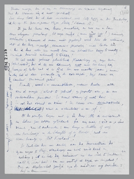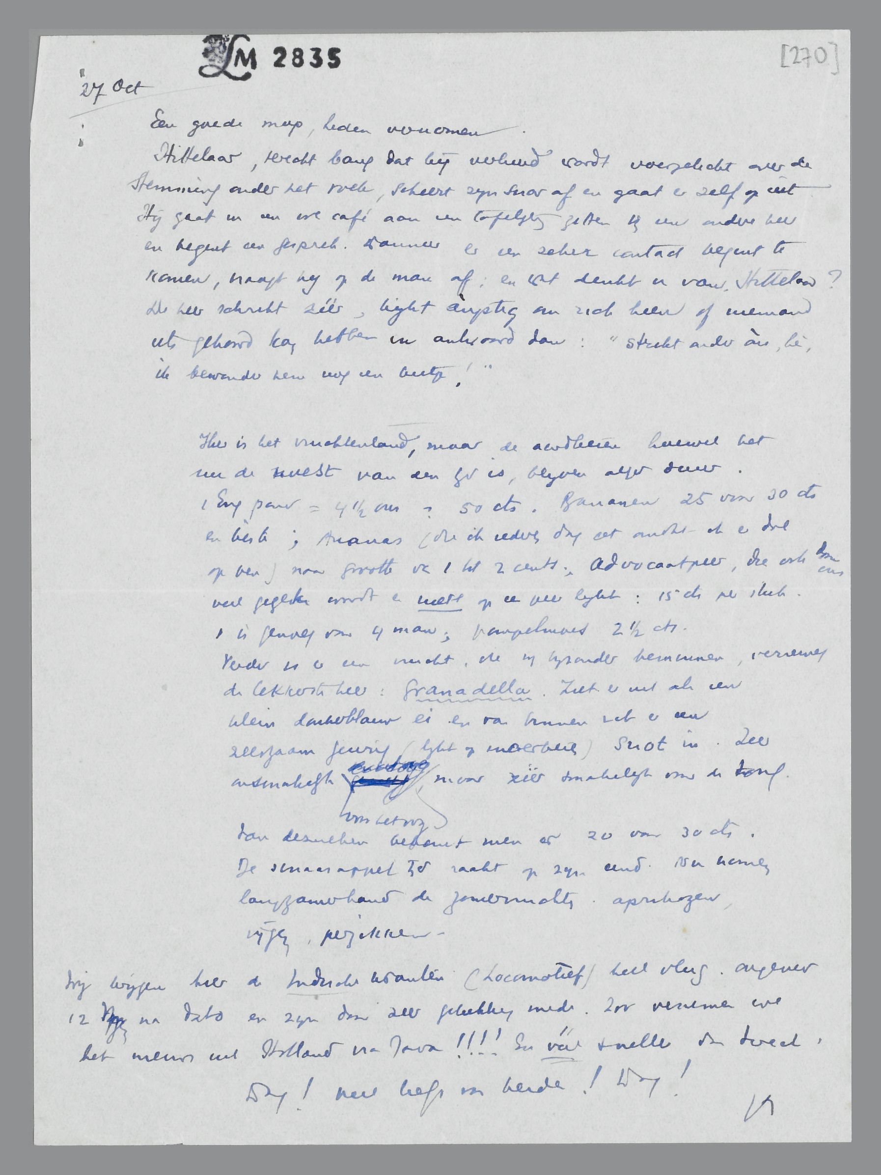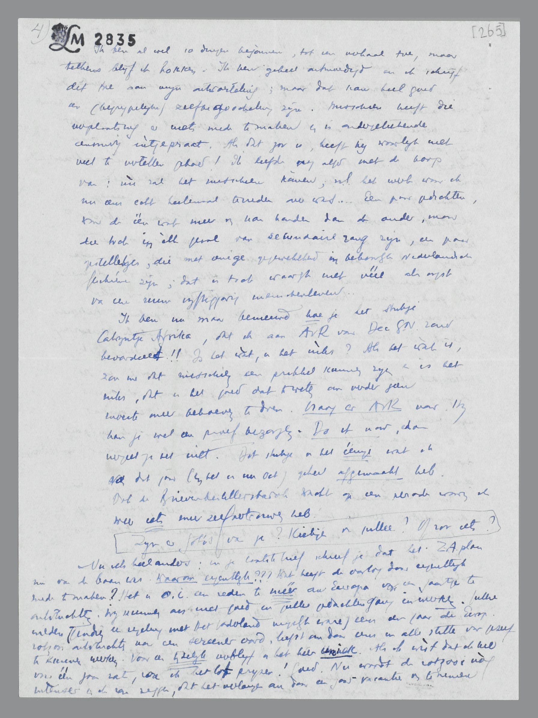 Nu iets heel anders: in je laatste brief schreef je dat het Z.A.plan nu van de baan was. Waarom eigentlijk??? Wat heeft de oorlog daar eigentlijk mede te maken? Het is o.i. een reden te méér om Europa een jaartje te ontvluchten. Wij kunnen ons niet goed in jullie gedachtengang ínwerken. Jullie wilden (indien een regeling met Het Vaderland mogelijk ware) eens een jaar de Europ. rotzooi ontvluchten naar een sereener oord, liefst om daar eens in alle stilte voor jezelf te kunnen werken. Voor een tijdelijk verblijf is het hier uniek. Als ik wíst dat ik hier voor één jaar zat, zou ik het lot prijzen! Goed. Nu wordt de rotzooi nóg intenser en ik zou zeggen, dat het verlangen om daar een jaar vacantie van te nemen dan ook nog veel sterker zou moeten worden. De consequentie moest zijn dat je je plan dus des te energieker en sneller ten uitvoer moest brengen en ziet... jij komt tot een tegenovergestelde slotsom: je stelt het sine die uit!