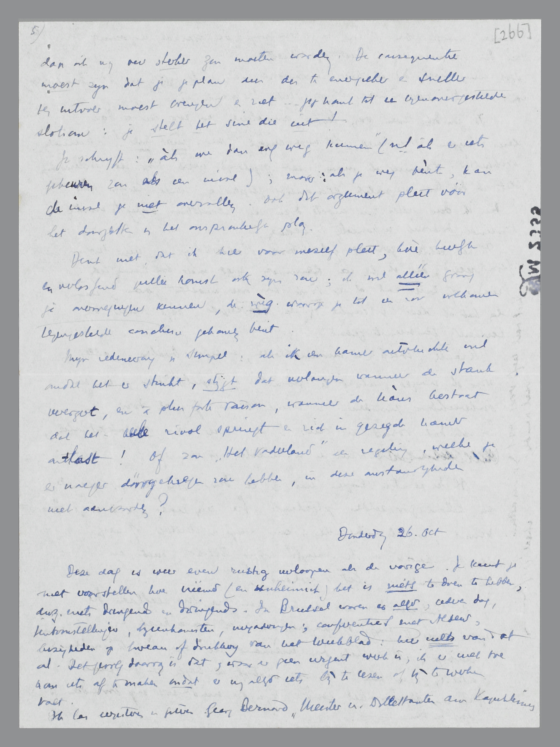 Het blijkt duidelijk dat ‘de omstandigheden’, waar men in onvruchtbare perioden immer de schuld aan geeft, van gering belang zijn. Als ik in Brussel tot niets goeds in staat was, gaf ik de schuld aan de journalistiek, welke mij sloopte! Nú is de journalistiek tot een verwaarloosbaar minimum beperkt en ik heb de 24 uur van het etmaal gehéél tot mij beschikking, zonder door wát ook te worden opgejaagd, en ik blijk al evenmin tot iets goeds in staat te zijn. Wie wat dringends mede te deelen heeft vindt daar altijd de gelegenheid toe, en wie léég is, kan ook al heeft hij niets dan vrije tijd, geen [2 onleesbare woorden] op papier krijgen!