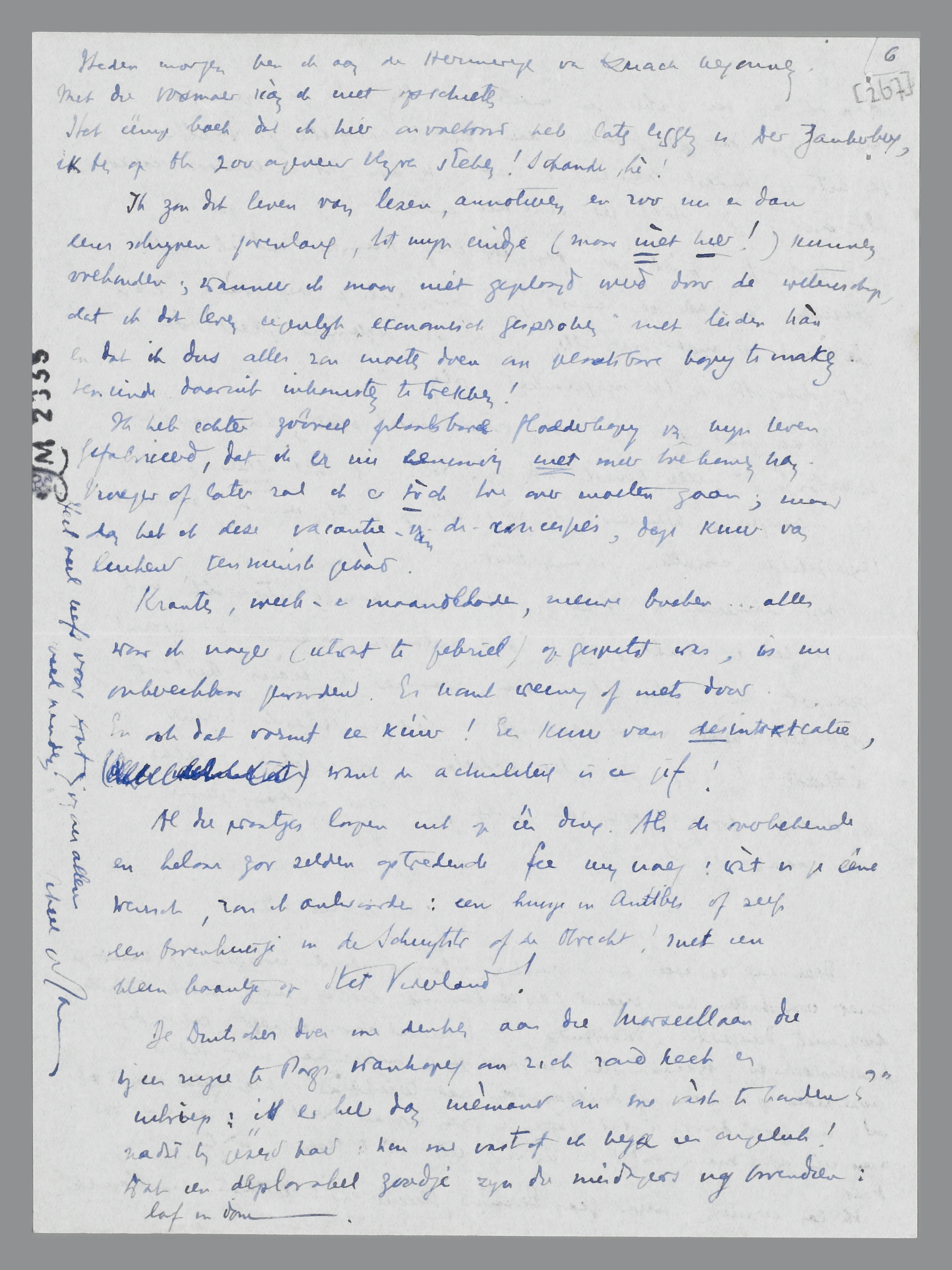 Ik zou dit leven van lezen, annoteeren en zoo nu en dan schrijven jarenlang, tot mijn einde (maar niet hier!) kunnen volhouden; wanneer ik maar niet geplaagd werd door de wetenschap, dat ik dit leven eigenlijk ‘economisch gesproken’ niet leiden kán en dat ik dus alles zou moeten doen om plaatsbare kopij te maken ten einde daaruit inkomsten te trekken! Ik heb echter zóóveel plaatsbare flodderkopij van mijn leven gefabriceerd, dat ik er nu eenvoudig niet meer toe komen kan. vroeger of later zal ik er tóch toe over moeten gaan; maar dan heb ik deze vacantie van de concessies[?], deze kuur van luiheid, tenminste gehád.