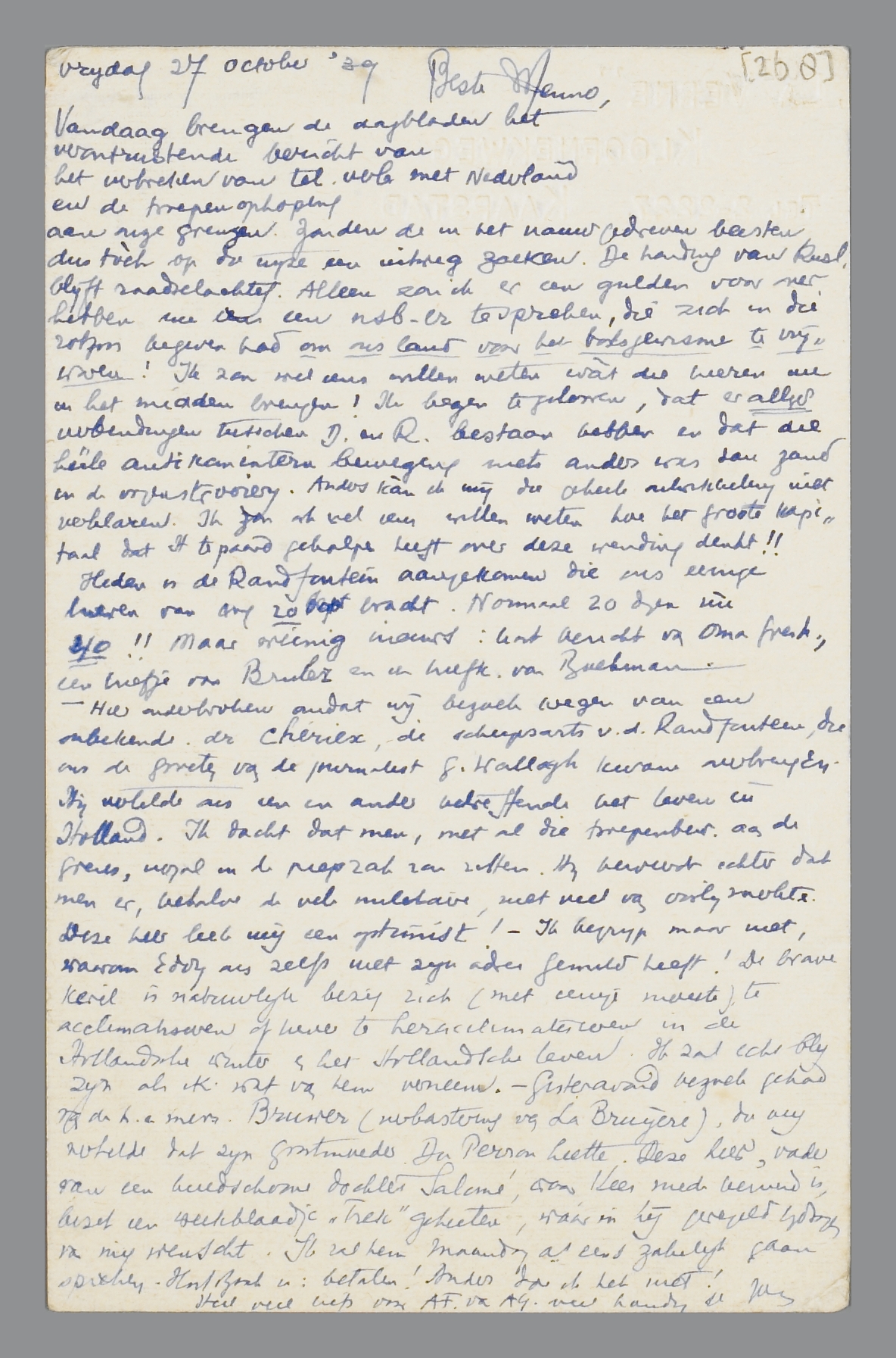 Vandaag brengen de dagbladen het verontrustende nieuws van het verbreken van tel. verb. met Nederland en de troepenophoping aan onze grenzen. Zouden de in het nauw gedreven beesten dus tòch op die wijze een uitweg zoeken. De wending van Rusl. Blijft raadselachtig. Alleen zou ik er een gulden voor over hebben nu eens een nsb-er te spreken, die zich in die rotzooi begeven had om ons land van het bolsjewisme te vrijwaren! Ik zou wel eens willen weten wat die heeren nu in het midden brengen! Ik begin te geloven, dat er altijd verbindingen tusschen D. en R. bestaan hebben en dat die hééle antkomintern beweging niets anders was dan zand in de oogenstrooierij. Anders kàn ik mij die geheele ontwikkeling niet verklaren. Ik zou ook wel eens willen weten hoe het groote kapitaal dat H te paard geholpen heeft over deze wending denkt!!