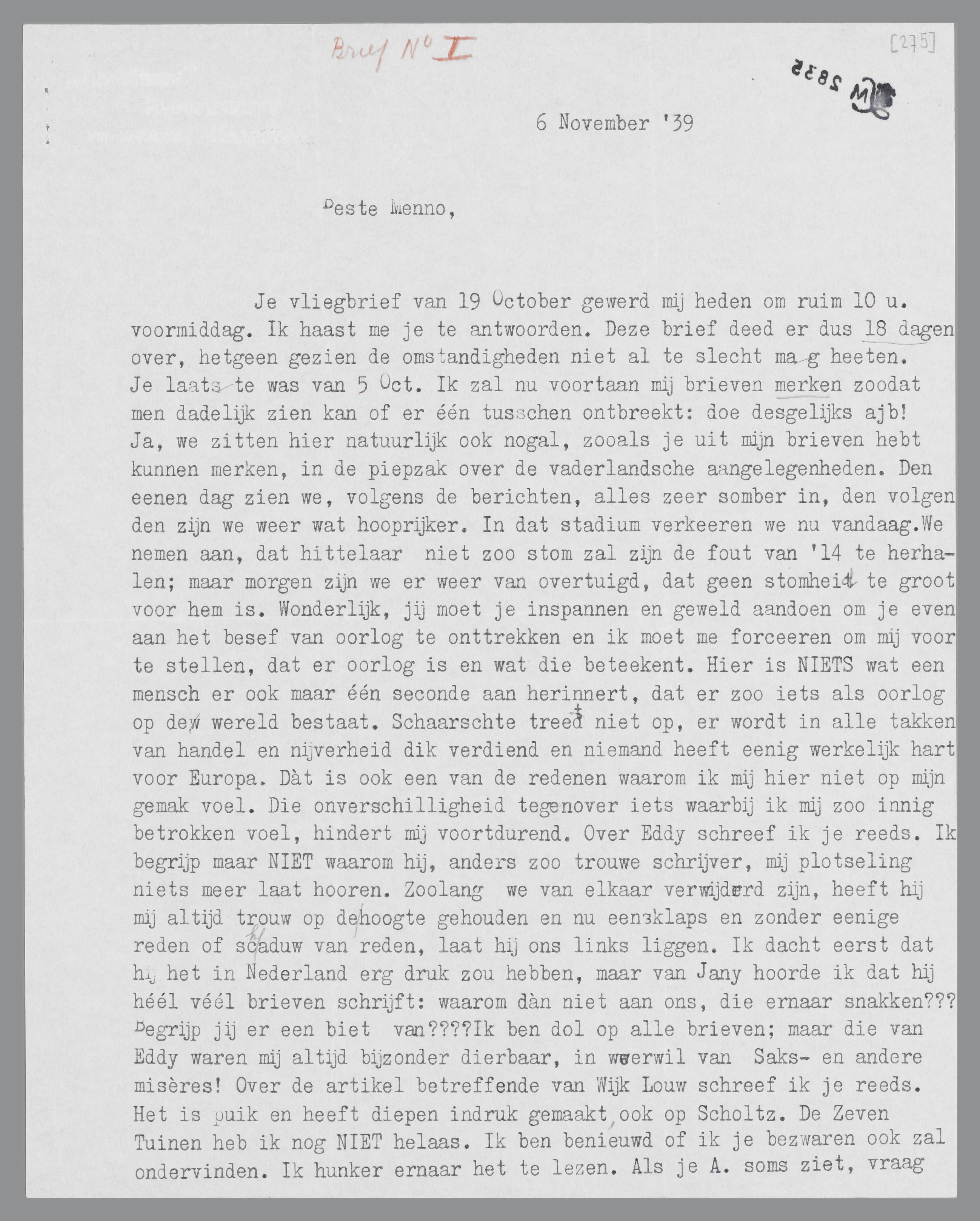 Je vliegbrief van 19 October gewerd mij heden om ruim 10 u. voormiddag. Ik haast me je te antwoorden. Deze brief deed er dus 18 dagen over, hetgeen gezien de omstandigheden niet al te slecht mag heeten. Je laatste was van 5 Oct. Ik zal nu voortaan mijn brieven merken zoodat men dadelijk zien kan of er één tusschen ontbreekt: doe desgelijks ajb! Ja, we zitten hier natuurlijk ook nogal, zooals je uit mijn brieven hebt kunnen merken, in de piepzak over de vaderlandsche aangelegenheden. Den eenen dag zien we, volgens de berichten, alles zeer somber in, den volgenden zijn we weer wat hooprijker. In dat stadium verkeeren we nu vandaag. We nemen aan, dat hittelaar niet zoo stom zal zijn de fout van '14 te herhalen; maar morgen zijn we er weer van overtuigd dat geen stomheid te groot voor hem is. Wonderlijk, jij moet je inspannen en geweld aandoen om je even aan het besef van oorlog te onttrekken en ik moet me forceeren om mij voor te stellen, dat er oorlog is en wat die beteekent. Hier is NIETS wat een mensch er ook maar één seconde aan herinnert, dat er zoo iets als oorlog op de wereld bestaat. Schaarschte treedt niet op, er wordt in alle takken van handel en nijverheid dik verdiend en niemand heeft eenig werkelijk hart voor Europa. Dàt is ook een van de redenen waarom ik mij hier niet op mijn gemak voel. Die onverschilligheid tegenover iets waarbij ik mij zoo innig betrokken voel, hindert mij voortdurend. Over Eddy schreef ik je reeds. Ik begrijp maar NIET waarom hij, anders zoo trouwe schrijver, mij plotseling niets meer laat hooren. Zoolang we van elkaar verwijderd zijn, heeft hij mij altijd trowu op de hoogte gehouden en nu eensklaps en zonder eenige reden of schaduw van reden, laat hij ons links liggen. Ik dacht eerst dat hij het in Nederland erg druk zou hebben, maar van Jany hoorde ik dat hij héél véél brieven schrijft: waarom dàn niet aan ons, die ernaar snakken??? Begrijp jij er een biet van???? Ik ben dol op alle brieven; maar die van Eddy waren mij altijd bijzonder dierbaar, in weerwil van Saks- en andere misères! Over de artikelen betreffende van Wijk Louw schreef ik je reeds. Het is puik en heeft diepen indruk gemaakt, ook op Scholtz. De Zeven Tuinen heb ik nog NIET helaas. Ik ben benieuwd of ik je bezwaren ook zal ondervinden. Ik hunker ernaar het te lezen. Als je A. soms ziet, vraag dan of mijn ex verzonden is. Over de flaars van Adriaan hoorde ik van een andere zijde, dat zij misschien wel intelligent mag zijn, maar daarbij dan toch een geborneerde geestdrijfster, die op een koppige wijze zonder eenig redelijk element staliniste is. Lijkt mij uit de verschillende beschrijvingen, met een klassiek woord van Jan van Nijlen: ‘nie-goe’