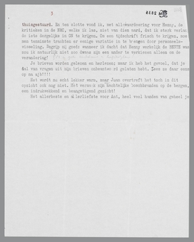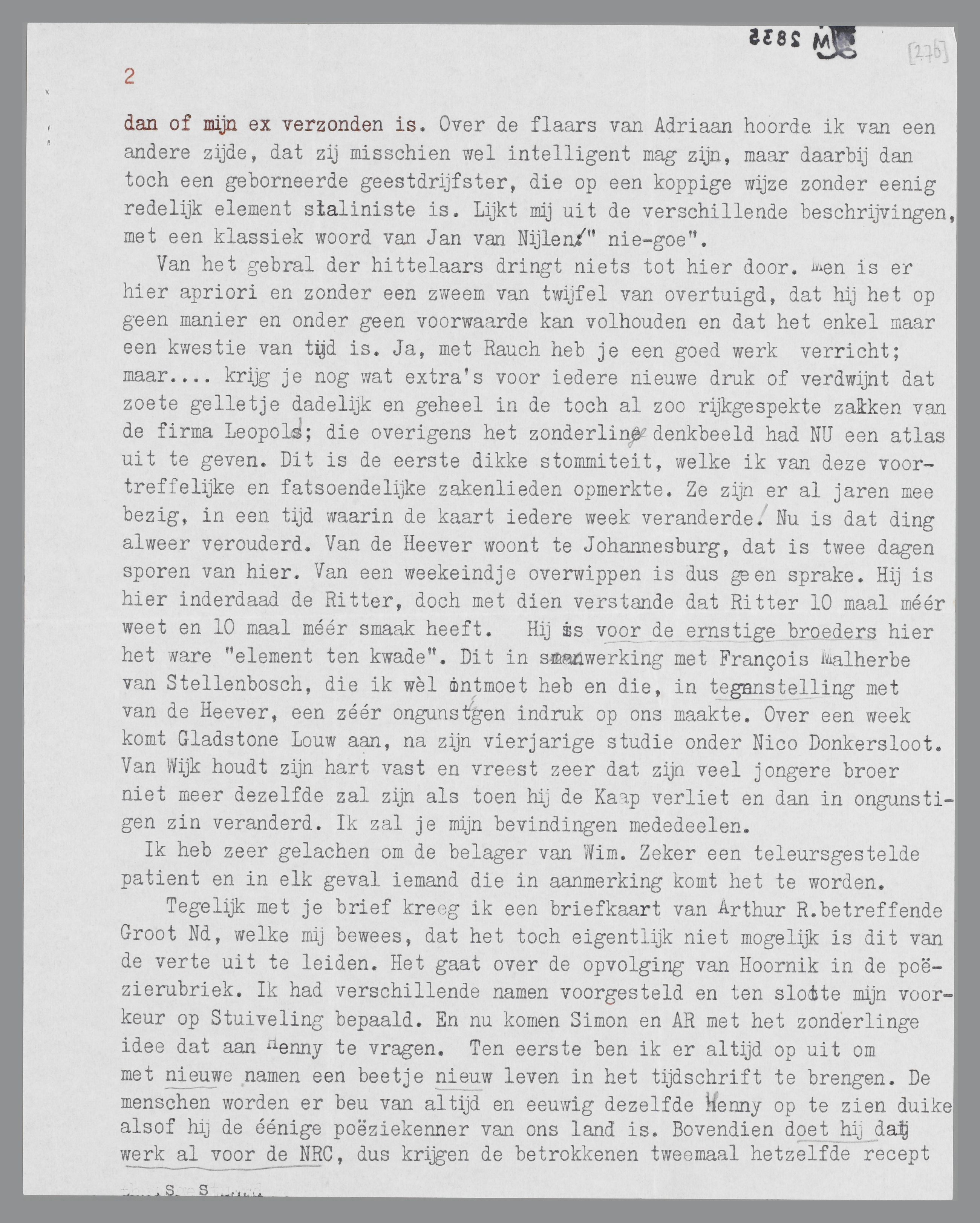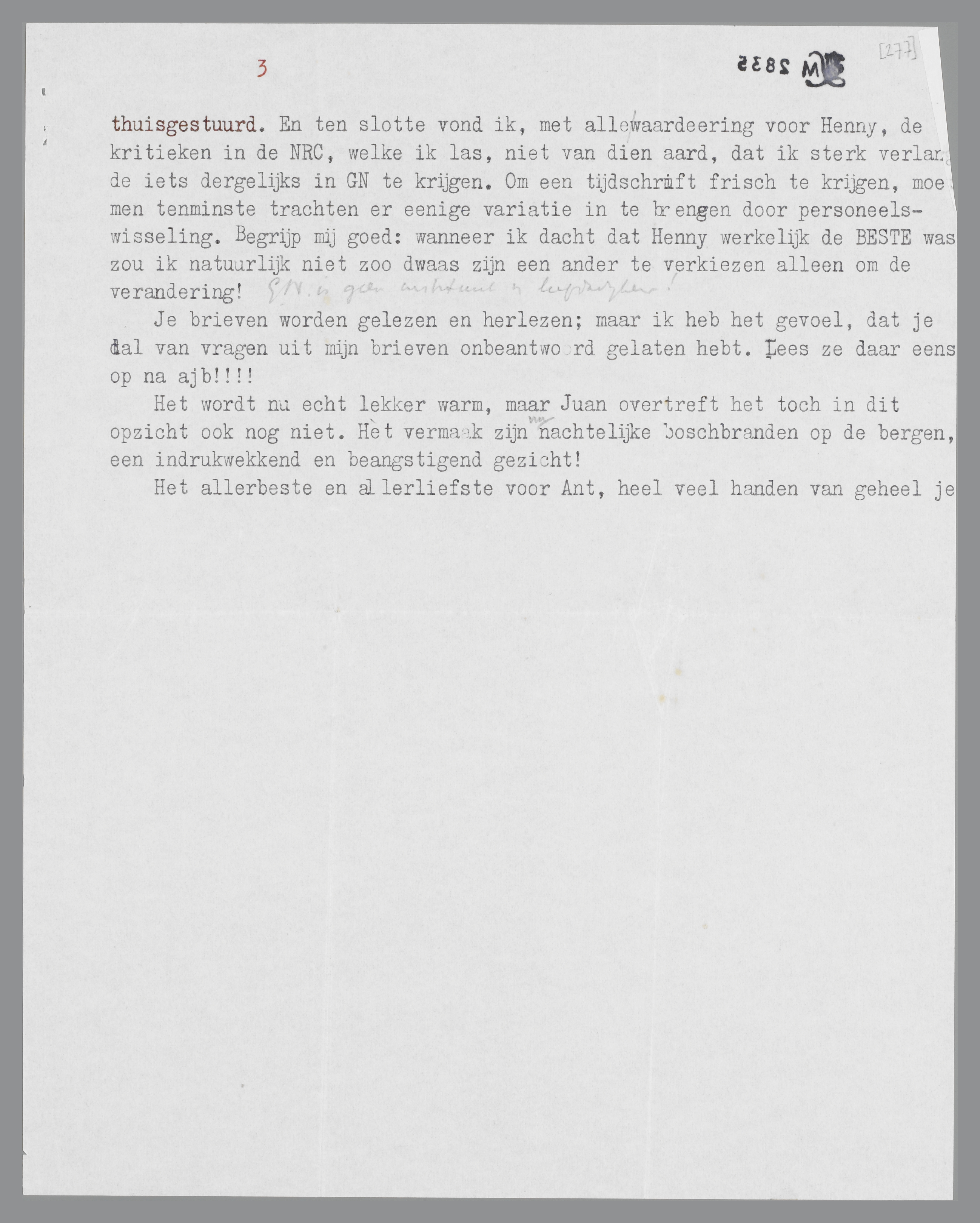 Tegelijk met je brief kreeg ik een briefkaart van Arthur R. betreffende Groot Nd, welke mij bewees, dat het toch eigentlijk niet mogelijk is dit van de verte uit te leiden. Het gaat over de opvolging van Hoornik in de poëzierubriek. Ik had verschillende namen voorgesteld en ten slotte mijn voorkeur op Stuiveling bepaald. En nu komen Simon en AR met het zonderlinge idee dat aan Henny te vragen. Ten eerste ben ik er altijd op uit met nieuwe namen een beetje nieuw leven in het tijdschrift te brengen. De menschen worden er beu van altijd en eeuwig dezelfde Henny op te zien duiken alsof hij de eenig poëziekenner van ons land is. Bovendien doet hij dat werk al voor de NRC, dus krijgen de betrokkenen tweemaal hetzelfde recept thuisgestuurd. En ten slotte vond ik, met alle waardering voor Henny, de kritieken in het NRC, welke ik las, niet van dien aard, dat ik sterk verlangde iets dergelijks in GN te krijgen. Om een tijdschrift frisch te krijgen, moet men tenminste trachten er eenige variatie in te brengen door personeelswisseling. Begrijp mij goed: wanneer ik dacht dat Henny werkelijk de BESTE was zou ik natuurlijk niet zoo dwaas zijn een ander te verkiezen alleen om de verandering! <G.N. is geen instituut van liefdadigheid!>