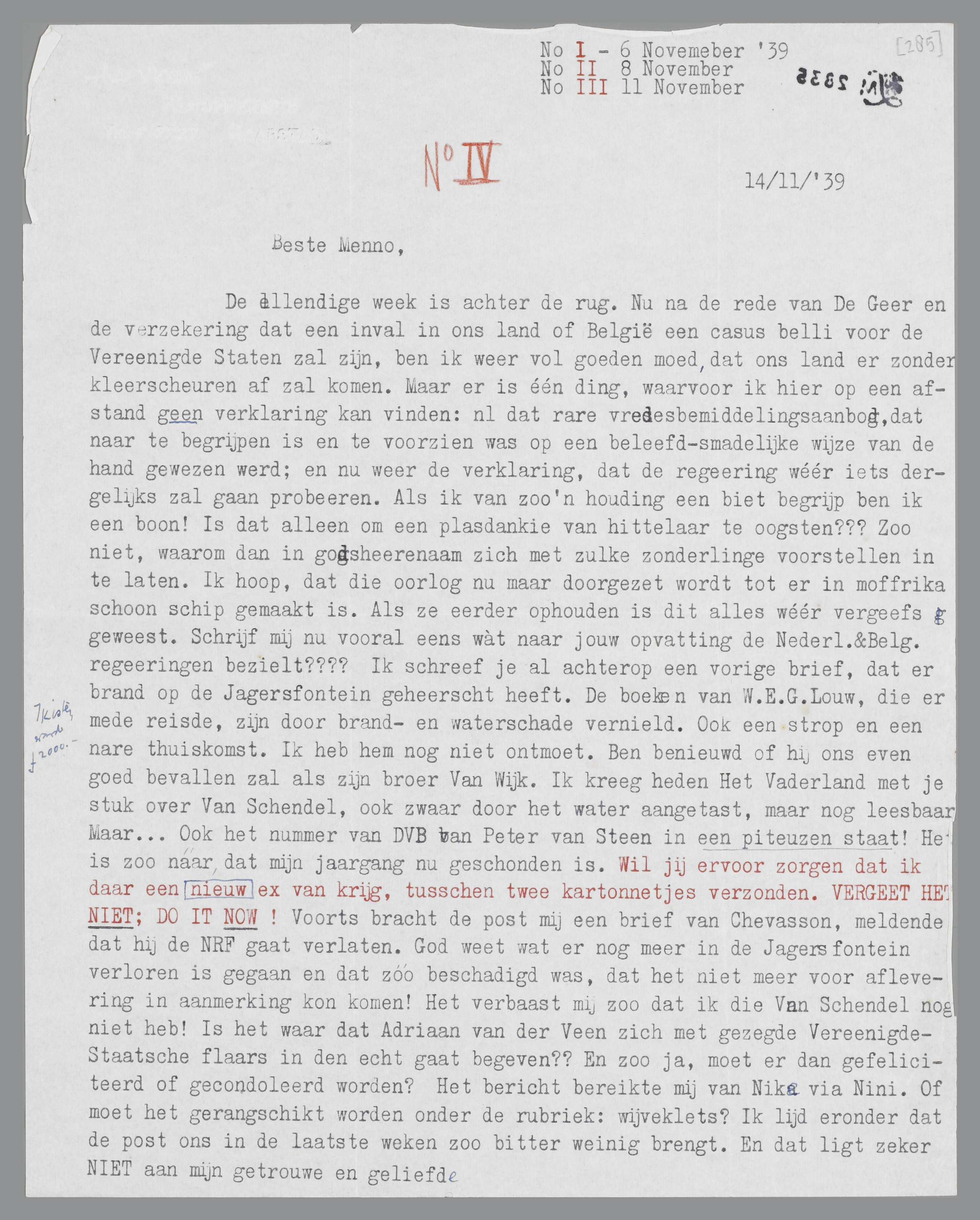 De ellendige week is achter de rug. Nu na de rede van De Geer en de verzekering dat een inval in ons land of België een casus belli voor de Vereenigde Staten zal zijn, ben ik weer vol goeden moed, dat ons land er zonder kleerscheuren af zal komen. Maar er is één ding, waarvoor ik hier op een afstand geen verklaring kan vinden: nl. dat rare vredesbemiddelingsaanbod, dat naar te begrijpen is en te voorzien was op een beleefd-smadelijke wijze van de hand gewezen werd; en nu weer de verklaring, dat de regeering wéér iets dergelijks zal gaan probeeren. Als ik van zoo'n houding een biet begrijp ben ik een boon! Is dat alleen om een plasdankie van hittelaar te oogsten??? Zoo niet, waarom dan in godsheerenaam zich met zulke zonderlinge voorstellen in te laten. Ik hoop, dat die oorlog nu maar doorgezet wordt tot er in moffrika schoon schip gemaakt is. Als ze eerder ophouden is dit alles wéér vergeefs geweest. Schrijf mij nu vooral eens wàt naar jouw opvatting de Nederl. & Belg. regeeringen bezielt???? Ik schreef je al achterop een vorige brief, dat er brand op de Jagersfontein geheerscht heeft. De boeken van W.E.G. Louw, die er mede reisde, zijn door brand- en waterschade vernield. <kisten waarde ƒ2000,-> Ook een strop en een nare thuiskomst. Ik heb hem nog niet ontmoet. Ben benieuwd of hij ons even goed bevallen zal als zijn broer Van Wijk. Ik kreeg heden Het Vaderland met je stuk over Van Schendel, ook zwaar door het water aangetast, maar nog leesbaar. Maar... Ook het nummer van DVB van Peter van Steen in een piteuzen staat! Het is zoo náár, dat mijn jaargang nu geschonden is. Wil jij ervoor zorgen dat ik daar een nieuw ex van krijg, tusschen twee kartonnetjes verzonden. VERGEET HET NIET; DO IT NOW! Voorts bracht de post mij een brief van Chevasson, meldende dat hij de NRF gaat verlaten. God weet wat er nog meer in de Jagersfontein verloren is gegaan en dat zóó beschadigd was, dat het niet meer voor aflevering in aanmerking kon komen! Het verbaast mij zoo dat ik die Van Schendel nog niet heb! Is het waar dat Adriaan van der Veen zich met gezegde Vereenigde-Staatsche flaars in den echt gaat begeven?? En zoo ja, moet er dan gefeliciteerd of gecondoleerd worden? Het bericht bereikte mij van Nike via Nini. Of moet het gerangschikt worden onder de rubriek: wijveklets? Ik lijd eronder dat de post ons in de laatste weken zoo bitter weinig brengt. En dat ligt zeker NIET aan mijn getrouwe en geliefde correspondenten; maar aan de zeer onregelmatige verbindingen te lucht en te water. Zoo bij voorbeeld Arthur van Rantwijk, de zorgzaamheid en de ijver zelf, heeft zeker niet nagelaten mij van tal van hangende zaken betreffende G op de hoogte te brengen. Maar ik ontving niets. En dan komt er natuurlijk weer op eens een heel pak tegelijk en dikwijls meerdere brieven van één afzender. Je kent dat trouwens, want ook omgekeerd schijnt het het geval te zijn.