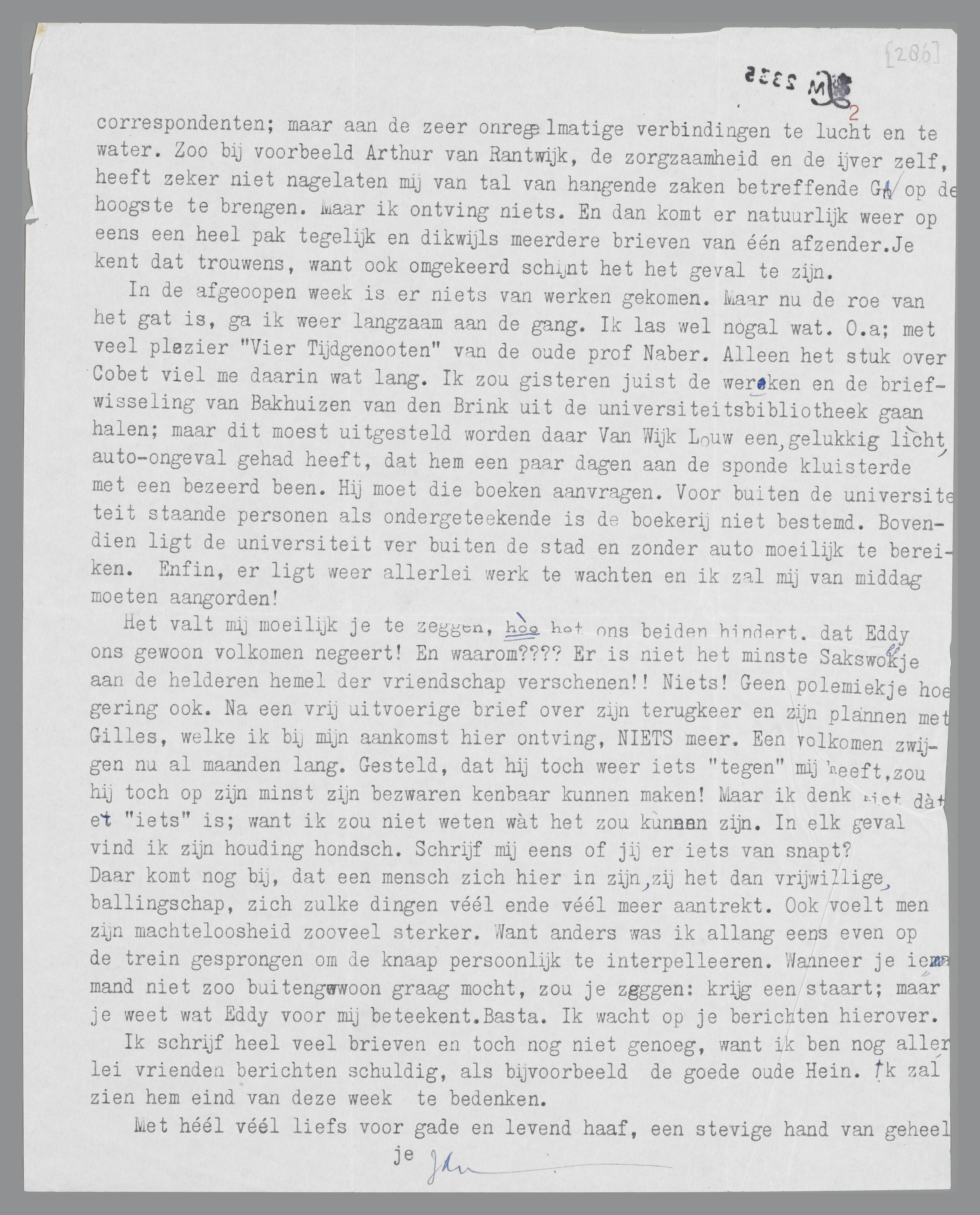 Het valt mij moeilijk je te zeggen, hòe het ons beiden hindert, dat Eddy ons gewoon volkomen negeert! En waarom???? Er is niet het minste Sakswolkje aan de helderen hemel der vriendschap verschenen!! Niets! Geen polemiekje hoe gering ook. Na een vrij uitvoerige brief over zijn terugkeer en zijn plannen met Gilles, welke ik bij mijn aankomst hier ontving, NIETS meer. Een volkomen zwijgen nu al maanden lang. Gesteld, dat hij toch weer iets ‘tegen’ mij heeft, zou hij toch op zijn minst zijn bezwaren kenbaar kunnen maken! Maar ik denk niet dàt er ‘iets’ is; want ik zou niet weten wàt het zou kùnnen zijn. In elk geval vind ik zijn houding hondsch. Schrijf mij eens of jij er iets van snapt? Daar komt nog bij, dat een mensch zich hier in zijn, zij het dan vrijwillige, ballingschap, zich zulke dingen véél ende véél meer aantrekt. Ook voelt men zijn machteloosheid zooveel sterker. Want anders was ik allang eens even op de trein gesprongen om de knaap persoonlijk te interpelleeren. Wanneer je iemand niet zoo buitengewoon graag mocht, zou je zeggen: krijg een staart; maar je weet wat Eddy voor mij beteekent. Basta. Ik wacht op je berichten hierover.