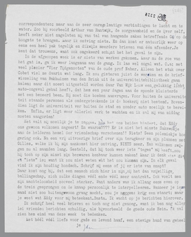 In de afgeloopen week is er niets van werken gekomen. Maar nu de roe van het gat is, ga ik weer langzaam aan de gang. Ik las wel nogal wat. O. a.; met veel plezier ‘Vier Tijdgenooten’ van de oude prof. Naber. Alleen het stuk over Cobet viel me daarin wat lang. Ik zou gisteren juist de werken en de briefwisseling van Bakhuizen van den Brink uit de universiteitsbibliotheek gaan halen; maar dit moest uitgesteld worden daar Van Wijk Louw een, gelukkig lìcht, auto-ongeval gehad heeft, dat hem een paar dagen aan de sponde kluisterde met een bezeerd been. Hij moet die boeken aanvragen. Voor buiten de universiteit staande personen als ondergeteekende is de boekerij niet bestemd. Bovendien ligt de universiteit ver buiten de stad en zonder auto moeilijk te bereiken. Enfin, er ligt weer allerlei werk te wachten en ik zal mij van middag moeten aangorden!