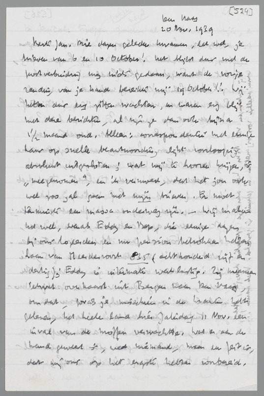 Wij maken het wel, evenals Eddy en Bep, die eenige dagen bij ons logeerden en nu pension betrokken hebben Laan van Meerdervoort 835 (achthonderd vijf en dertig); Eddy is uitermate werklustig. Zij kwamen overhaast uit Bergen naar Den Haag, omdat, zooals je misschien in de kranten hebt gelezen, het heele land hier Zaterdag 11 Nov. een inval van de moffen verwachtte. Wat er aan de hand geweest is, weet niemand, maar een feit is, dat wij ons op het ergste hebben voorbereid. De Duitsche troepen zouden al in beweging zijn, er zouden 70 officieren en N.S.B.ers wegens complot spionage gearresteerd zijn etc. Maar Zondag ontwaakten we nog als Nederlanders en Maandag kwam De Geer psalmzingend voor de radio om te zeggen, dat er niets, absoluut niets aan de hand was! Er is echter stevig ‘geknepen’ dien nacht, vooral in het Oosten, waar de menschen huilend op straat moeten hebben geloopen volgens verhaal van mijn moeder, onder geroep: ‘Hitler komt!’ (Dat 's mans schedel kort daarvoor niet gekraakt is door dien bomaanslag, heeft ons allen ontzaglijk gehinderd; in ieder geval wijst dit gebaar erop, dat er iets niet heelemaal in orde is bij deze volksstammen, hoe en waar dan ook.)