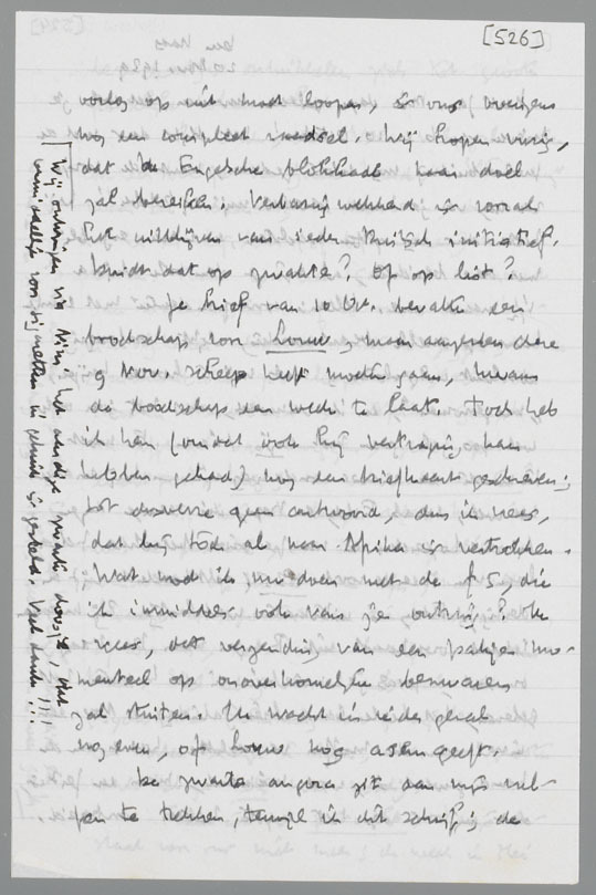 Drie dagen geleden kwamen, let wel, je brieven van 6 en 10 October! Het blijkt dus met de postverbinding nog niets gedaan, want de vorige zending van je hand bereikte mij 19 October!! Wij hebben dus erg zitten wachten, en waren erg blij met deze berichten, al zijn ze dan ook bijna anderhalve maand oud. Alleen: correspondentie met eenige kans op snelle beantwoording lijkt voorloopig absoluut uitgesloten; wat wij te hooren krijgen, is ‘meegenomen’, en ik vermoed, dat het jou ook wel zoo zal gaan met mijn brieven. Er moet tenminste een massa onderweg zijn.
