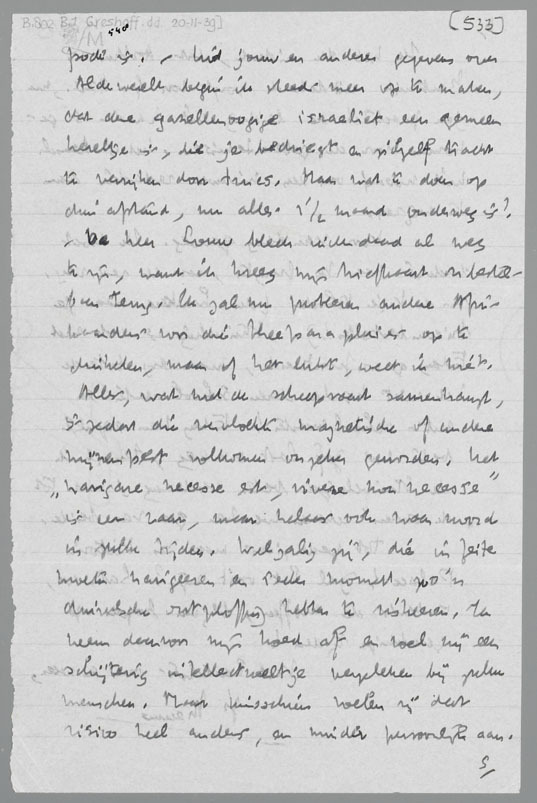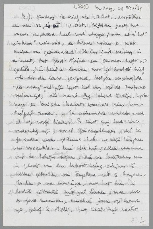Vandaag je brief van 23 Oct., eergisteren die van 12, 16 en 18 Oct. Blijkbaar gaat het vervoer omgekeerd heel wat vlugger, maar al is het ‘nieuws’ wat oud, de brieven worden er niet minder om gewaardeerd! Ik las juist vandaag in de krant, dat Zuid-Afrika een censuur heeft ingesteld, ten bewijze daarvan was je laatste brief ook door den censor geopend, hetgeen ongetwijfeld zeer noodig zal zijn met het oog op de mofsche spionnage, die overal erg schijnt te zijn. Spionnage en Duitsche karakterloosheid gaan voortreffelijk samen. Ik antwoordde verleden week al op vorige brieven. Er moet nog heel wat onderweg zijn, vooral Zondagsbladen, die ik je iedere week gestuurd heb na mijn terugkeer van vacantie. - Hier alles wel, alleen benauwen ons de talrijke wijzen, die de Duitschers nu in plaats van de Uboot krieg schijnen te willen gebruiken om Engeland uit te hongeren. Ik ben er van overtuigd, dat het hun in laatste instantie niet zal lukken, maar dat er zure maanden, misschien jaren op komst zijn, geloof ik stellig. Het nazi-tuig vecht voor zijn kliek bestaan, met den rug tegen den afgrond; het zal, liever Europa uitmoorden dan abdiceeren. Daarom houden wij ons hier, evenals de Finnen, steeds op het ergste voorbereid. De Grebbelinie staat permanent onder wake, zooals ik laatst met eigen oogen kon constateeren. Neutraliteit is een formule en een farce; wij zijn niet neutraal, wij zullen, als het er op aankomt, moeten kiezen voor Engeland, willen wij niet verpruist worden; of die keuze oorlog zal impliceeren, weet nu nog niemand, maar het zou mij niet verbazen. Ik, die laf ben, hoop tegen dien tijd zooveel moed gekweekt te hebben, dat ik mee kan doen, voorzoover practisch mogelijk, want ook wij zitten in dit geval opgesloten tusschen de Waterlinie en een ‘ondermijnde’ zee.