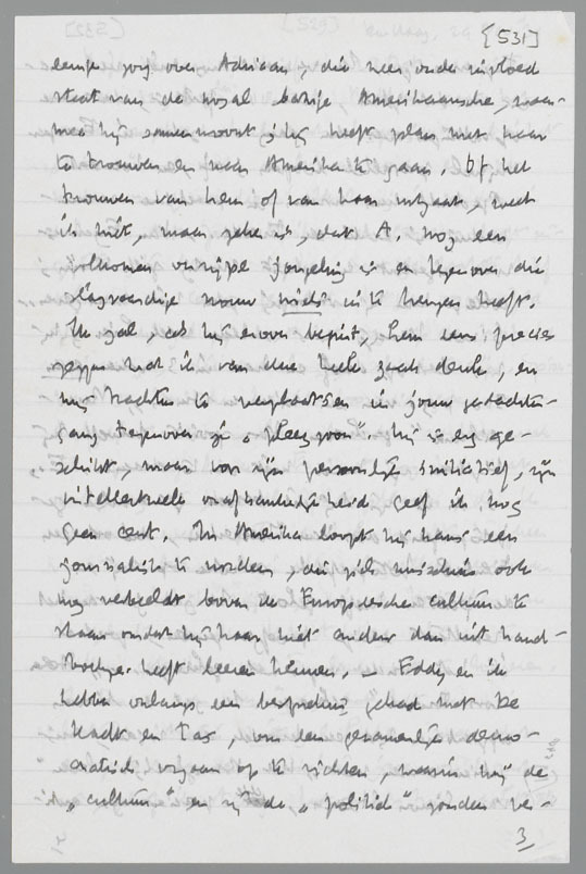 Dank ook voor knipsel Die Brandwag. Ik heb sedert dien geen stuk meer gestuurd, omdat ik dacht, dat de bestelling onmogelijk vertraagd zou geschieden. Binnenkort hoop ik weer iets te zenden. - Wij maken ons eenige zorg over Adriaan, die zeer onder invloed staat van de nogal bazige Amerikaansche, waarmee hij samenwoont; hij heeft plan met haar te trouwen en naar Amerika te gaan. Of het trouwen van hem of van haar uitgaat, weet ik niet, maar zeker is, dat A. nog een volkomen onrijpe jongeling is en tegenover die slagvaardige vrouw niets in te brengen heeft. Ik zal, als hij erover begint, hem eens precies zeggen wat ik van deze heele zaak denk, en mij trachten te verplaatsen in jouw gedachtengang tegenover je ‘pleegzoon’. Hij is erg geschikt, maar voor zijn persoonlijk initiatief, zijn intellectueele onafhankelijkheid geef ik nog geen cent. In Amerika loopt hij kans een journalist te worden, die zich misschien ook nog verbeeldt boven de Europeesche cultuur te staan omdat hij haar niet anders dan uit handboekjes heeft leeren kennen. - Eddy en ik hebben onlangs een bespreking gehad met De Kadt en Tas, om een gezamenlijk democratisch orgaan op te richten, waarin wij de ‘cultuur’ en zijn heele ‘politiek’ zouden vertegenwoordigen. Ik verwacht nog niet veel succes van dat plan, maar een feit is, dat onze opvattingen over de gang van zaken in Europa vrijwel parallel loopen; of, en hoe dat uitgedrukt kan worden in practische samenwerking is echter een tweede. - Van Eyck is weer ingestort en schijnt ernstig ziek te zijn; college kan hij voorloopig zeker niet meer geven. - Simon Vestdijk was verleden week hier; hij is best op dreef en had in 3 weken even 300 pag.'s van een nieuwen roman ‘Rumeiland’ geschreven. Voor zooiets behoeft hij blijkbaar zijn hand niet om te draaien. E., S. en ik zijn bij dit bezoek gezamenlijk gefotografeerd door Van Moerkerken, die ook een tiental fotografische schoten op mij en de poesen heeft gelost. Ik zal je van het resultaat eenige proefjes zenden, zoodra ik het onder oogen heb gekregen. Ik zal er binnen afzienbaren tijd een kroniek aan wijden, misschien samen met ‘Het Burgerlijk Leven’ van Simon Stevin, die precies je antipode is. - Uit jouw en andere gegevens over Aldewerelt begin ik steeds meer op te maken, dat deze gazellenoogige israeliet een gemeen kereltje is, die je bedriegt en zichzelf tracht te verrijken door trucs. Maar wat te doen op dien afstand, nu alles 1½ maand onderweg is?