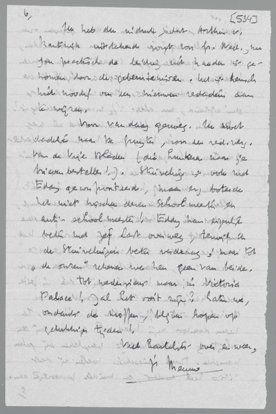 Voor vandaag genoeg. Ik moet dadelijk naar De Gruyter, voor den red. verg. van de Vrije Bladen (die hunkeren naar je brievenbesteller!). Stuiveling is ook met Eddy geconfronteerd, maar erg boterde het niet tusschen dezen schoolmeester en antischoolmeester! Eddy kan eigenlijk beter met Jef Last overweg, terwijl ik den Stuivelingen beter verdraag, maar tot ‘de onzen’ rekenen we hen geen van beide.