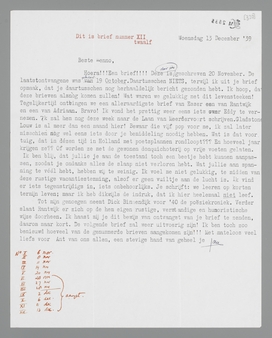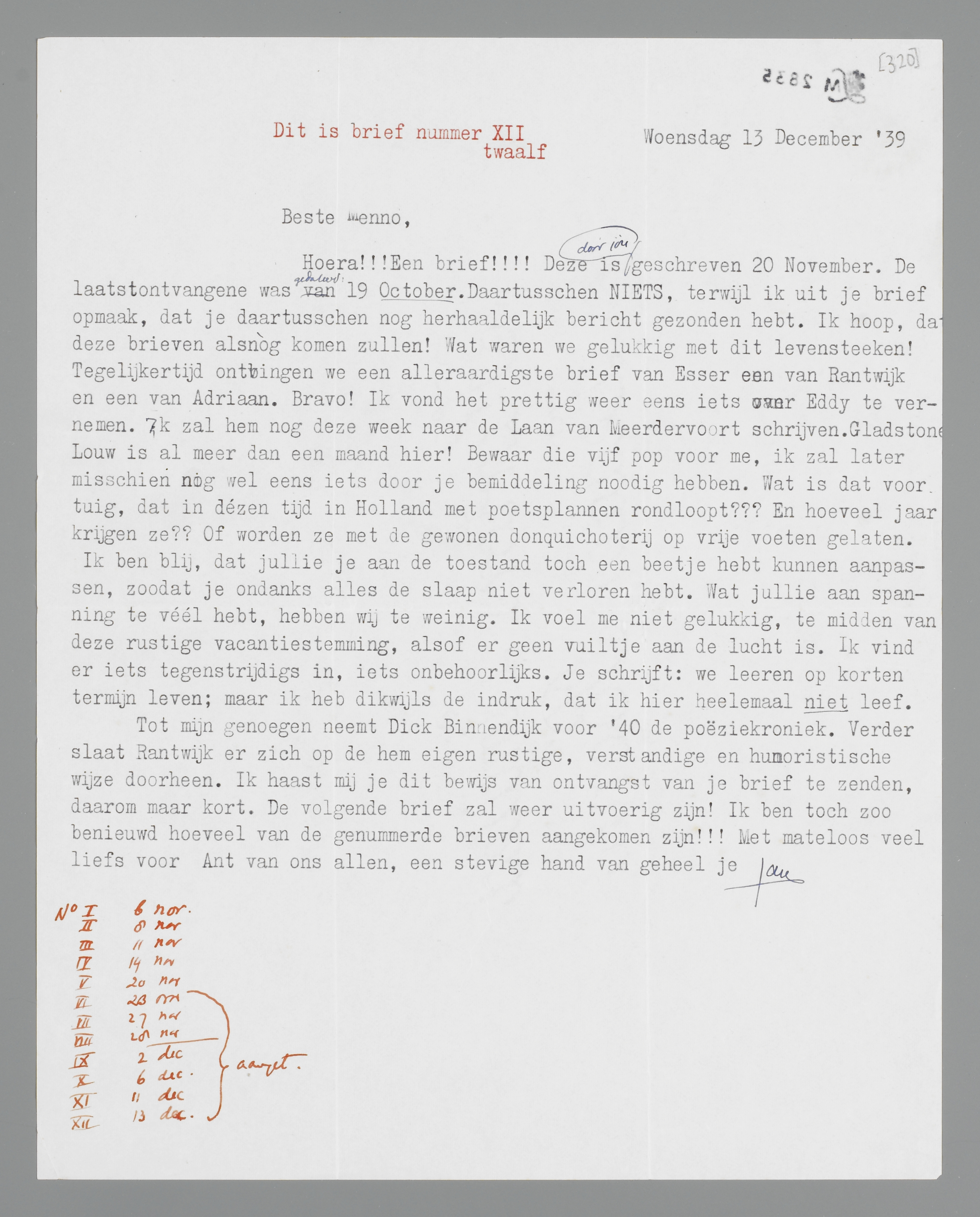Tot mijn genoegen neemt Dick Binnendijk voor '40 de poëziekroniek. Verder slaat Rantwijk er zich op de hem eigen rustige, verstandige en humoristische wijze doorheen. Ik haast mij je dit bewijs van ontvangst van je brief te zenden, daarom maar kort. De volgende brief zal weer uitvoerig zijn! Ik ben toch zoo benieuwd hoeveel van de genummerde brieven aangekomen zijn!!! Met mateloos veel liefs voor Ant van ons allen, een stevige hand van geheel je Jan