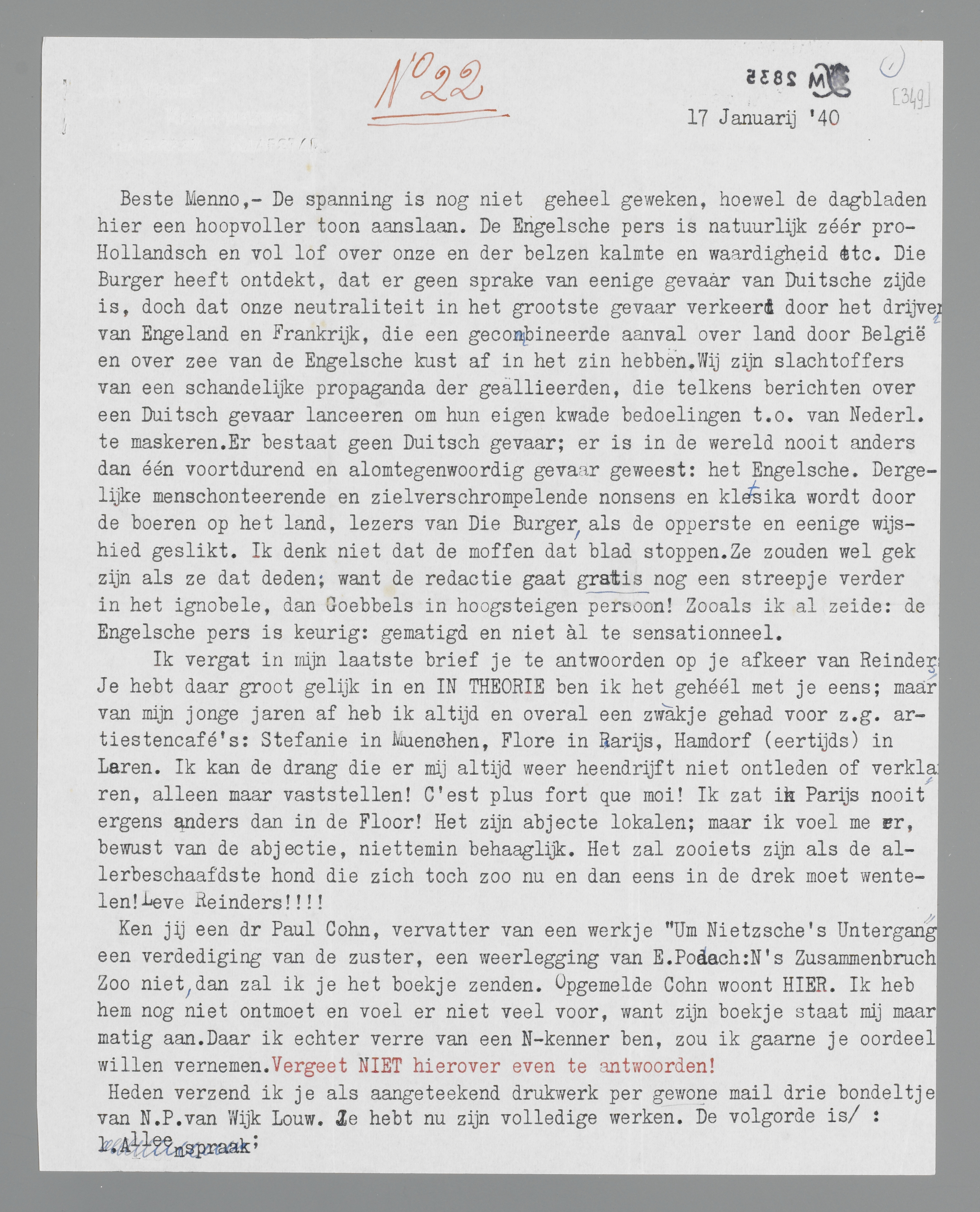 Ken jij een dr Paul Cohn, vervatter van een werkje ‘Um Nietzsche's Untergang’ een verdediging van de zuster, een weerlegging van E. Podach: N's Zusammenbruch Zoo niet, dan zal ik je het boekje zenden. Opgemelde Cohn woont HIER. Ik heb hem nog niet ontmoet en voel er niet veel voor, want zijn boekje staat mij maar matig aan. Daar ik echter verre van een N-kenner ben, zou ik gaarne je oordeel willen vernemen. Vergeet NIET hierover even te antwoorden!