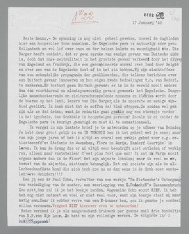 De spanning is nog niet geheel geweken, hoewel de dagbladen hier een hoopvoller toon aanslaan. De Engelsche pers is natuurlijk zéér pro Hollandsch en vol lof over onze en der belzen kalmte en waardigheid etc. Die Burger heeft ontdekt, dat er geen sprake is van eenige gevaar van Duitsche zijde is, doch dat onze neutraliteit in het grootste gevaar verkeert door het drijven van Engeland en Frankrijk, die een gecombineerde aanval over land door België en over zee van de Engelsche kust af in het zin hebben. Wij zijn slachtoffers van een schandelijke propaganda der geallieerden, die telkens berichten over een Duitsch gevaar lanceeren om hun eigen kwade bedoelingen t.o. van Nederl. te maskeren. Er bestaat geen Duitsch gevaar; er is in de wereld nooit anders dan één voortdurend en alomtegenwoordig gevaar geweest: het Engelsche. Dergelijke menschonteerende en zielverschrompelende nonsens en kletsika wordt door de boeren op het land, lezers van Die Burger, als de opperste en eenige wijsheid geslikt. Ik denk niet dat de moffen dat blad stoppen. Ze zouden wel gek zijn als ze dat deden; want de redactie gaat gratis nog een streepje verder in het ignobele, dan Goebbels in hoogsteigen persoon! Zooals ik al zeide: de Engelsche pers is keurig: gematigd en niet àl te sensationeel.