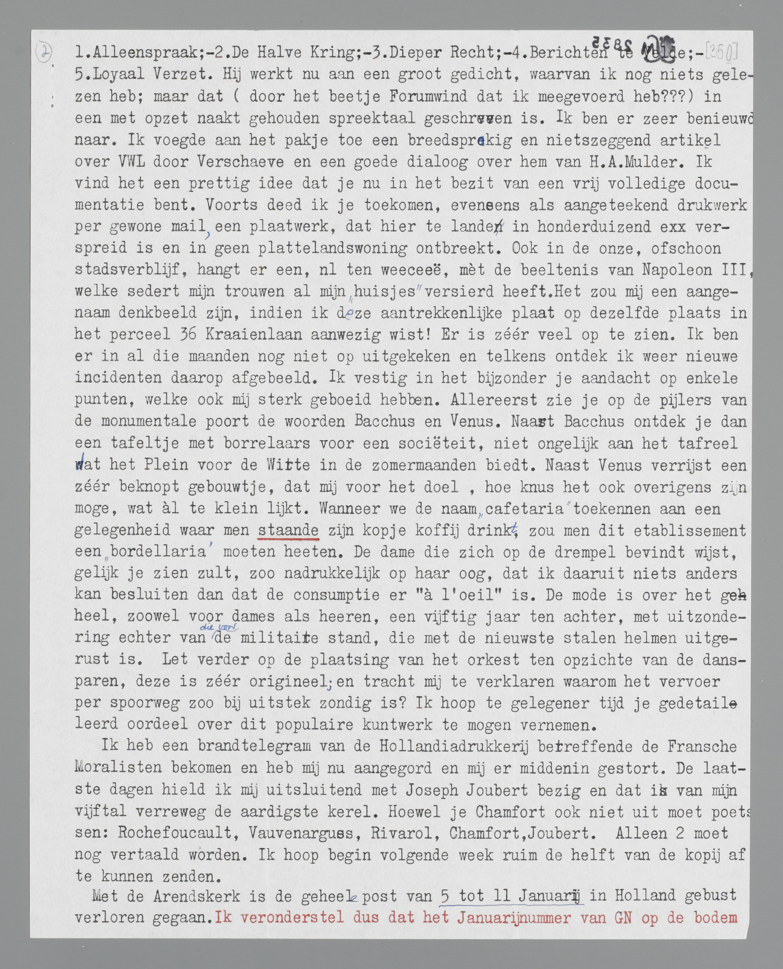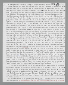 Heden verzend ik je als aangeteekend drukwerk per gewone mail drie bondeltjes van N.P. van Wijk Louw. Je hebt nu zijn volledige werken. De volgorde is: 1. Alleenspraak; -2. De Halve Kring; -3. Dieper Recht; -4. Berichten te Velde; -5. Loyaal Verzet. Hij werkt nu aan een groot gedicht, waarvan ik nog niets gelezen heb; maar dat (door het beetje Forumwind dat ik meegevoerd heb???) in een met opzet naakt gehouden spreektaal geschreven is. Ik ben er zeer benieuwd naar. Ik voegde aan het pakje toe een breedsprakig en nietszeggend artikel over VWL door Verschaeve en een goede dialoog over hem van H.A. Mulder. Ik vind het een prettig idee dat je nu in het bezit van een vrij volledige documentatie bent. Voorts deed ik je toekomen, eveneens als aangeteekend drukwerk per gewone mail, een plaatwerk, dat hier te lande in honderdduizend exx verspreid is en in geen plattelandswoning ontbreekt. Ook in de onze, ofschoon stadverblijf, hangt er een, nl ten weeceeë, mèt de beeltenis van Napoleon III, welke sedert mijn trouwen al mijn ‘huisjes’ versierd heeft. Het zou mij een aangenaam denkbeeld zijn, indien ik deze aantrekkenlijke plaat op dezelfde plaats in het perceel 36 Kraaienlaan aanwezig wist! Er is zéér veel op te zien. Ik ben er in al die maanden nog niet op uitgekeken en telkens ontdek ik weer nieuwe incidenten daarop afgebeeld. Ik vestig in het bijzonder je aandacht op enkele punten, welke ook mij sterk geboeid hebben. Allereerst zie je op de pijlers van de monumentale poort de woorden Bacchus en Venus. Naast Bacchus ontdek je dan een tafeltje met borrelaars voor sociëteit, niet ongelijk aan het tafreel dat het Plein voor De Witte in de zomermaanden biedt. Naast Venus verrijst een zéér beknopt gebouwtje, dat mij voor het doel, hoe knus het ook overigens zijn moge, wat àl te klein lijkt. Wanneer we de naam ‘cafetaria’ toekennen aan een gelegenheid waar men staande zijn kopje koffij drinkt, zou men dit etablissement een ‘bordellaria’ moeten heeten. De dame die zich op de drempel bevindt wijst, gelijk je zien zult, zoo nadrukkelijk op haar oog, dat ik daaruit niet anders kan besluiten dan dat de consumptie er ‘à l'oeil’ is. De mode is over het geheel, zoowel voor dames als heeren, een vijftig jaar ten achter, met uitzondering echter van die voor de militaire stand, die met de nieuwste stalen helmen uitgerust is. Let verder op de plaatsing van het orkest ten opzichte van de dansparen, deze is zéér origineel; en tracht mij te verklaren waarom het vervoer per spoorweg zoo bij uitstek zondig is? Ik hoop te gelegenertijd je gedetailleerd oordeel over dit populaire kunstwerk te mogen vernemen.