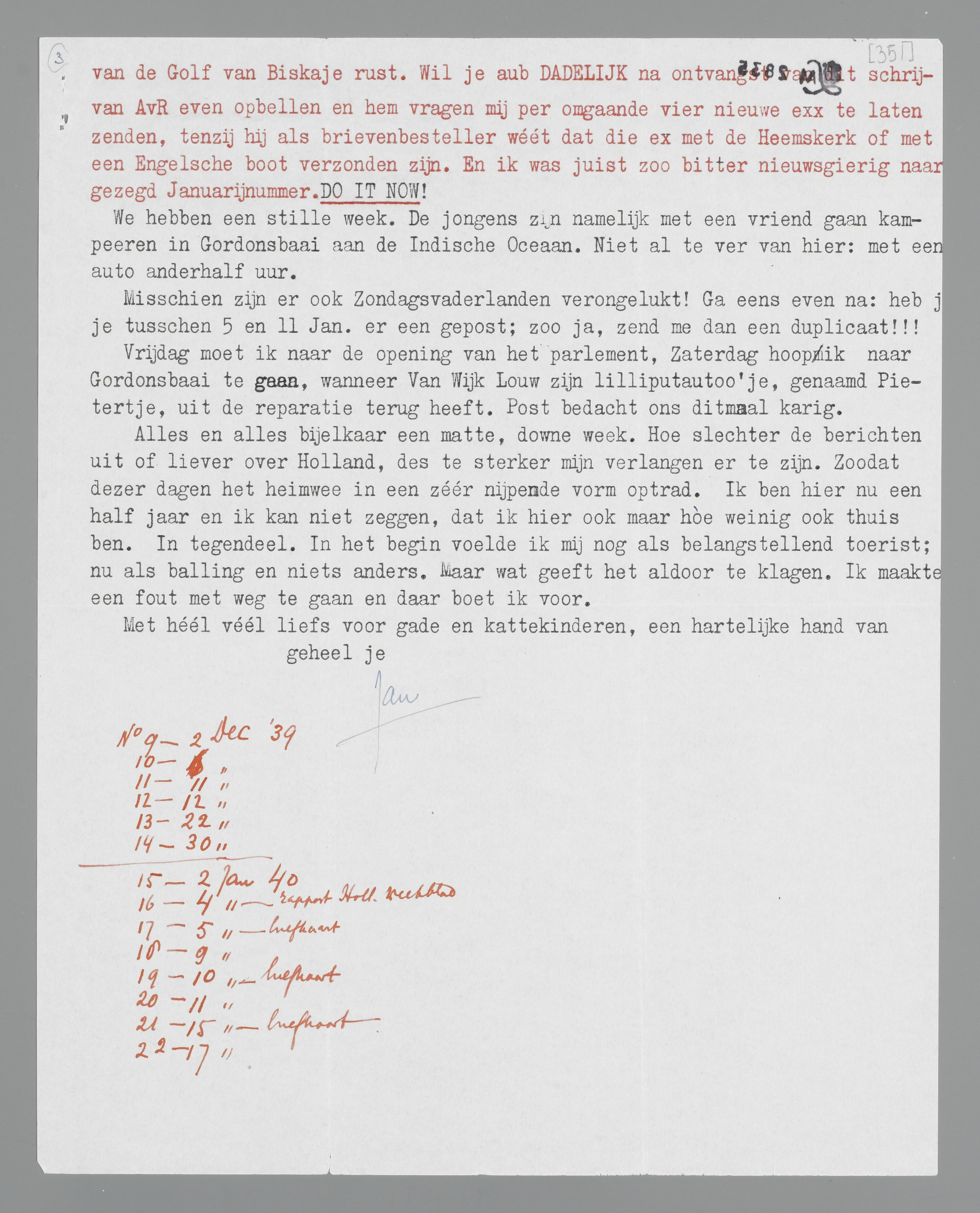 Met de Arendskerk is de geheele post van 5 tot 11 Januarij in Holland gebust verloren gegaan. Ik veronderstel dus dat het Januarijnummer van GN op de bodem van de Golf van Biskaje rust. Wil je aub DADELIJK na ontvangst van dit schrijven AvR even opbellen en hem vragen mij per omgaande vier nieuwe exx te laten zenden, tenzij hij als brievenbesteller wéét dat die ex met de Heemskerk of met een Engelsche boot verzonden zijn. En ik was juist zoo bitter nieuwsgierig naar gezegd Januarijnummer. DO IT NOW!