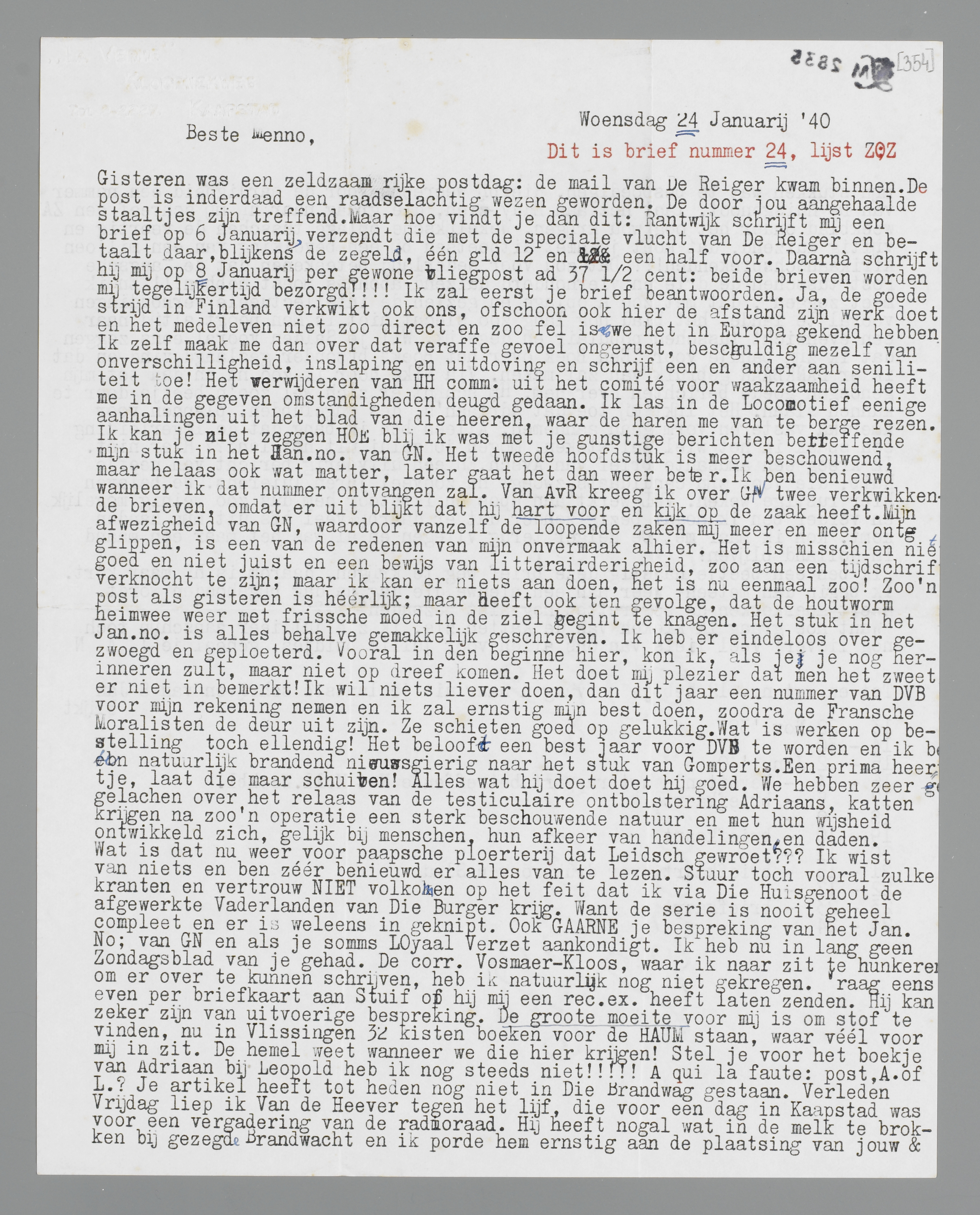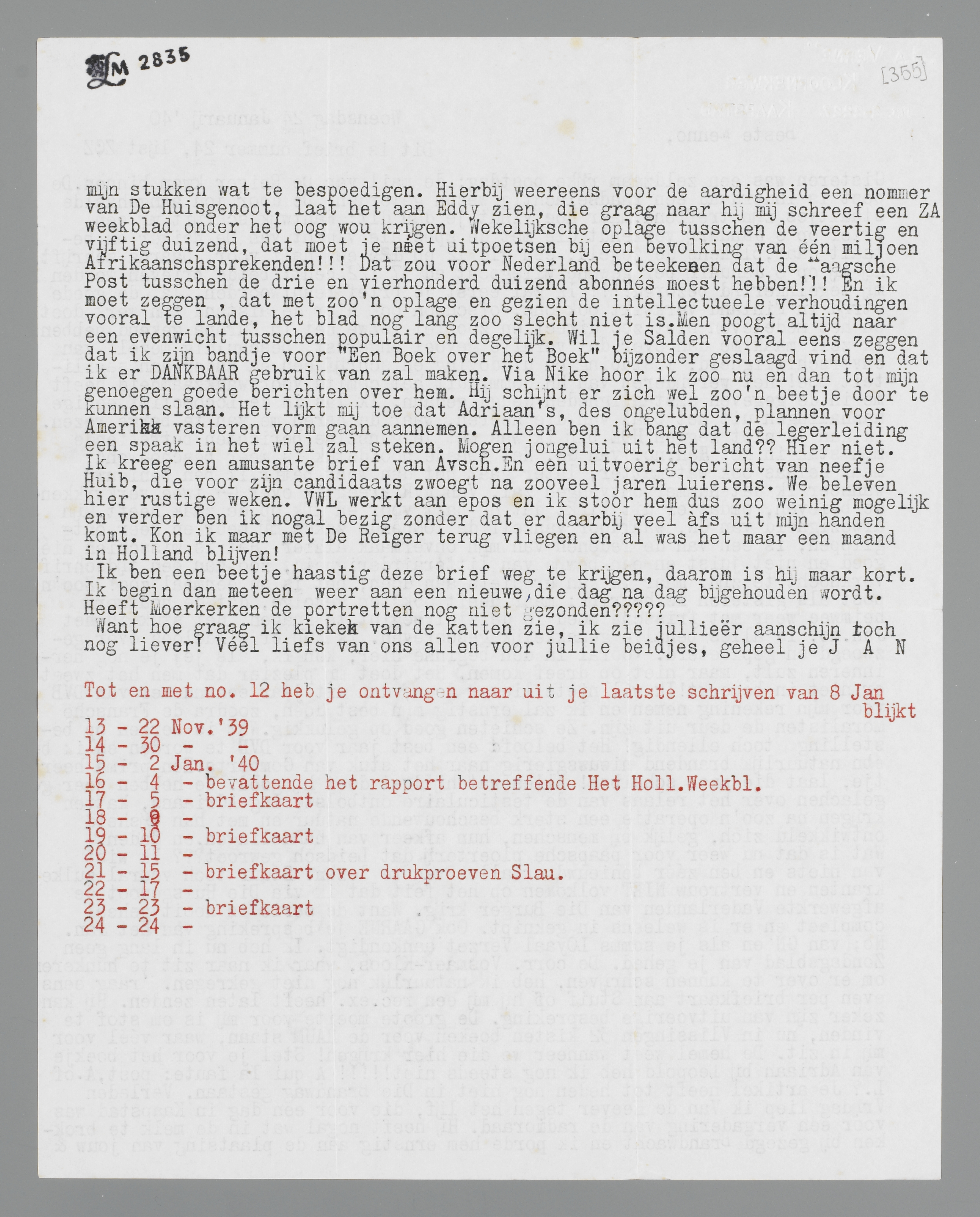Gisteren was een zeldzaam rijke postdag: de mail van De Reiger kwam binnen. De post is inderdaad een raadselachtig wezen geworden. De door jou aangehaalde staaltjes zijn treffend. Maar hoe vind je dan dit: Rantwijk schrijft mij een brief op 6 Januarij, verzendt die met de speciale vlucht van De Reiger en betaalt daar, blijkens de zegel, één gulden 12 en een half voor. Daarnà schrijft hij mij op 8 Januarij per gewone vliegpost ad 37 1/2 cent: beide brieven worden mij tegelijkertijd bezorgd!!! Ik zal eerst je brief beantwoorden. ja de goede strijd in Finland verkwikt ook ons, ofschoon ook hier de afstand zijn werk doet en het medeleven niet zoo direct en zoo fel is als we het in Europa gekend hebben. Ik zelf maak me dan over dat veraffe gevoel ongerust, beschuldig mezelf van onverschilligheid, inslaping en uitdoving en schrijf een en ander aan seniliteit toe! Het verwijderen van HH comm. uit het comité van waakzaamheid heeft me in de gegeven omstandigheden deugd gedaan. Ik las in de Locomotief eenige aanhalingen uit het blad van die heeren, waar de haren me van te berge rezen. Ik kan je niet zeggen HOE blij ik was met je gunstige berichten betreffende mijn stuk in het Jan. no. van GN. Het tweede hoofdstuk is meer beschouwend, maar helaas ook wat matter, later gaat het dan weer beter. Ik ben benieuwd wanneer ik dat nummer ontvangen zal. Van AvR kreeg ik over GN twee verkwikkende brieven, omdat er uit blijkt dat hij hart voor en kijk op de zaak heeft. Mijn afwezigheid van GN, waardoor vanzelf de loopende zaken mij meer en meer ontglippen, is een van de redenen waarom van mijn onvermaak alhier. Het is misschien niet goed en niet juist en een bewijs van litterairderigheid, zoo aan een tijdschrift verknocht te zijn; maar ik kan er niets aan doen, het is nu eenmaal zoo! Zoo'n post als gisteren is héérlijk; maar heeft ook ten gevolge, dat de houtworm heimwee weer met frissche moed in de ziel begint te knagen. Het stuk in het Jan. no. is alles behalve makkelijk beschreven. Ik heb er eindeloos over gezwoegd en geploeterd. Vooral in den beginne hier, kon ik, als je je nog herinneren zult, maar niet op dreef komen. Het doet mij plezier dat men het zweet er niet in bemerkt! Ik wil niets liever doen, dan dit jaar een nummer van DVB voor mijn rekening nemen en ik zal ernstig mijn best doen, zoodra de Fransche Moralisten de deur uit zijn. Ze schieten goed op gelukkig. Wat is werken op bestelling toch ellendig! Het belooft een best jaar voor DVB te worden en ik ben natuurlijk brandend nieuwsgierig naar het stuk van Gomperts. Een prima heertje, laat die maar schuiven! Alles wat hij doet doet hij goed. We hebben zeer gelachen om de testiculaire ontbolstering Adriaans, katten krijgen na zoo'n operatie een sterk beschouwende natuur en met hun wijsheid ontwikkeld zich, gelijk bij menschen, hun afkeer van handelingen en daden.