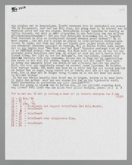 Wat is dat nu weer voor een paapsch ploerterij in dat Leidsch gewroet??? Ik wist van niets en ben zéér benieuwd er alles van te lezen. Stuur toch vooral zulke kranten en vertrouw NIET volkomen op het feit dat ik via Die Huisgenoot de afgewerkte Vaderlanden van Die Burger krijg. Want de serie is nooit geheel compleet en er is weleens in geknipt. Ook gaarne je bespreking van het Jan. no. van GN en als je soms Loyaal Verzet aankondigt. Ik heb nu in lang geen Zondagsblad van je gehad. De corr. Vosmaer-Kloos, waar ik naar zit te hunkeren om er over te kunnen schrijven, heb natuurlijk nog niet gekregen. Vraag eens even per briefkaart aan Stuif of hij mij een rec. ex. heeft laten verzenden. Hij kan zeker zijn van uitvoerige bespreking. De groote moeite voor mij is om stof te vinden, nu in Vlissingen 32 kisten boeken voor de HAUM staan, waar véél voor mij bij zit. De hemel weet wanneer we die hier krijgen! Stel je voor het boekje van Adriaan bij Leopold heb ik nog steeds niet!!! A qui la faute: post, A. of L.? Je artikel heeft tot heden nog niet in Die Brandwag gestaan. Verleden Vrijdag liep ik Van de Heever tegen het lijf, die voor een dag in Kaapstad was voor een vergadering van de radioraad. Hij heeft nogal wat in de melk te brokkelen bij gezegde Brandwacht en ik porde hem ernstig aan de plaatsing van jouw & mijn stukken wat te bespoedigen. Hierbij weer eens voor de aardigheid een nommer van De Huisgenoot laat het aan Eddy zien, die graag naar hij mij schreef een ZA weekblad onder het oog wou krijgen. Wekelijksche oplage tusschen de veerig en vijftig duizend, dat moet niet uitpoetsen bij een bevolking van één miljoen Afrikaansschsprekenden!!! Dat zou voor Nederland beteekenen dat de Haagsche Post tusschen drie en vierhonderdduizend abonnés moest hebben!!! En ik moet zeggen, dat met zoo'n oplage en gezien de intellectueele verhoudingen vooral te lande, het blad nog lang zoo slecht niet is. Men poogt altijd naar een evenwicht tusschen populair en degelijk. Wil je Salden vooral eens zeggen dat ik zijn bandje voor ‘Een boek over het Boek’ bijzonder geslaagd vind en dat ik er dankbaar gebruik van zal maken. Via Nike hoor ik zoo nu en dan tot mijn genoegen goede berichten over hem. Hij schijnt er zich wel zoo'n beetje door te kunnen slaan. Het lijkt mij toe dat Adriaan's, des ongelubden, plannen voor Amerika vasteren vorm aan gaan nemen. Alleen ben ik bang dat de legerleiding een spaak in het wiel zal steken. Mogen jonglui uit het land?? Hier niet. Ik kreeg een amusante brief van Avsch. En een uitvoerig bericht van neefje Huib, die voor zijn candidaats zwoegt na zooveel jaren luierens. We beleven hier rustige weken. VWL werkt aan een epos en ik stoor hem dus zoo weinig mogelijk en verder ben ik nogal bezig zonder dat er daarbij veel uit mijn handen komt. Kon ik maar met De Reiger terug vliegen en al was het maar een maand in Holland blijven!