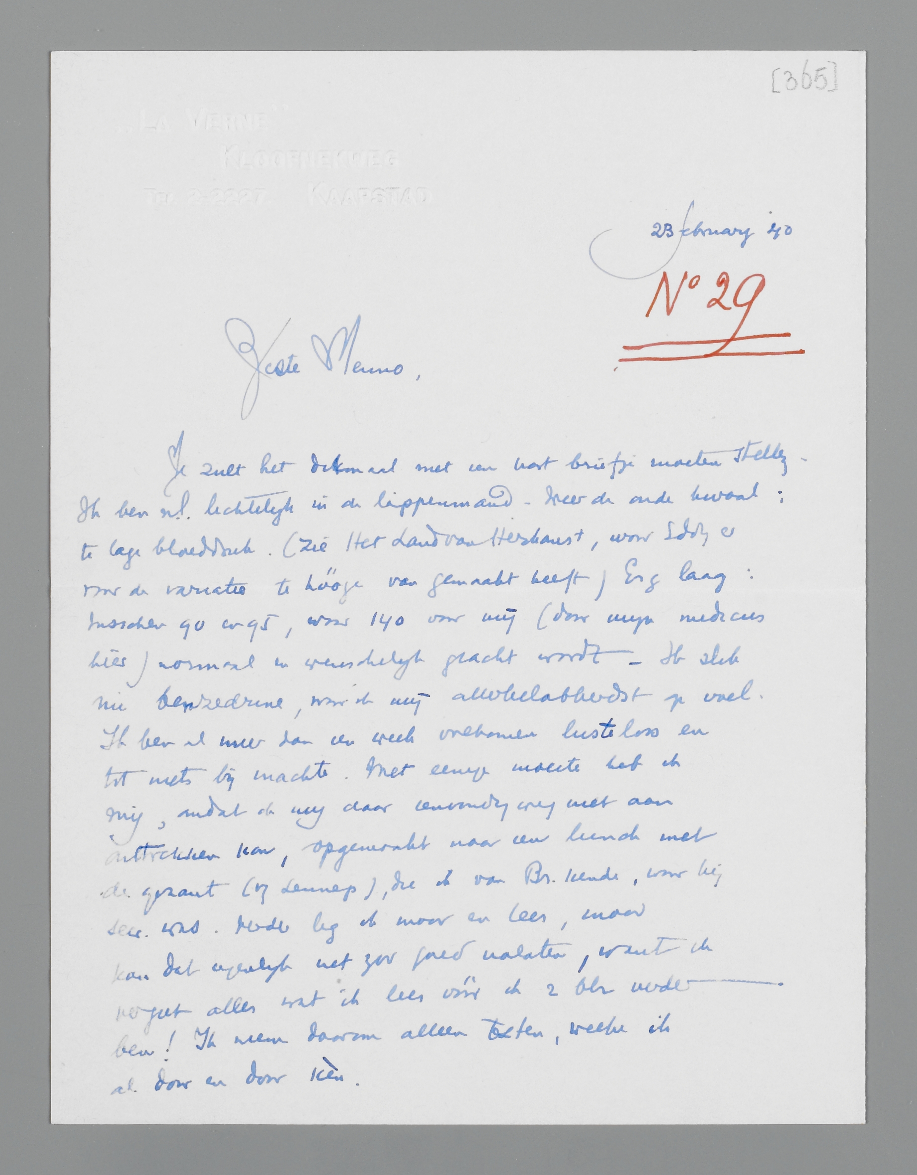 Nu allerbest, ik schrijf spoedig uitvoeriger. Dit is maar een spoedantwoord op je brief. Ik hoop, dank zij mijn doktertje, een bijzonder aardige paddevette zoon van Sem, spoedig weer een normaal bloeddrukje te hebben en wat opgewekter te worden! Héél véél liefs voor allen, en in het bijzonder voor Ant en je zelf,