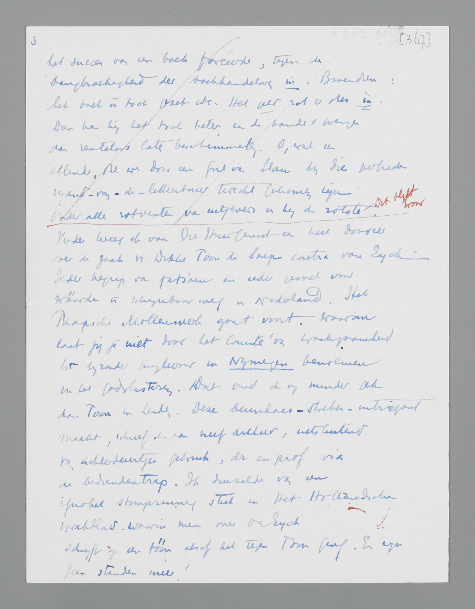 Hoe wéét hij dat er geen belangstelling v.h. publiek is?? Dat kan hij niet weten. Ik kan alleen zeggen: er is geen belangstelling bij het hoerenvolk de boekverkopers. Maar het zou heusch niet de eerste keer zijn, dat het publiek het succes van een boek forceerde, tegen de bangbroekigheid der boekhandelaren in. Bovendien: het boek is toch gezet etc. Het geld zit er dus in. Dan kan hij het toch beter in de handel brengen dan renteloos laten beschimmelen. O, wat een ellende, die nu door een fout van Slau bij die [perfide] vijand-van-de-litteratuur terecht gekomen zijn. Onder alle rotventen van uitgevers is hij de rotste <dit blijft waar>.