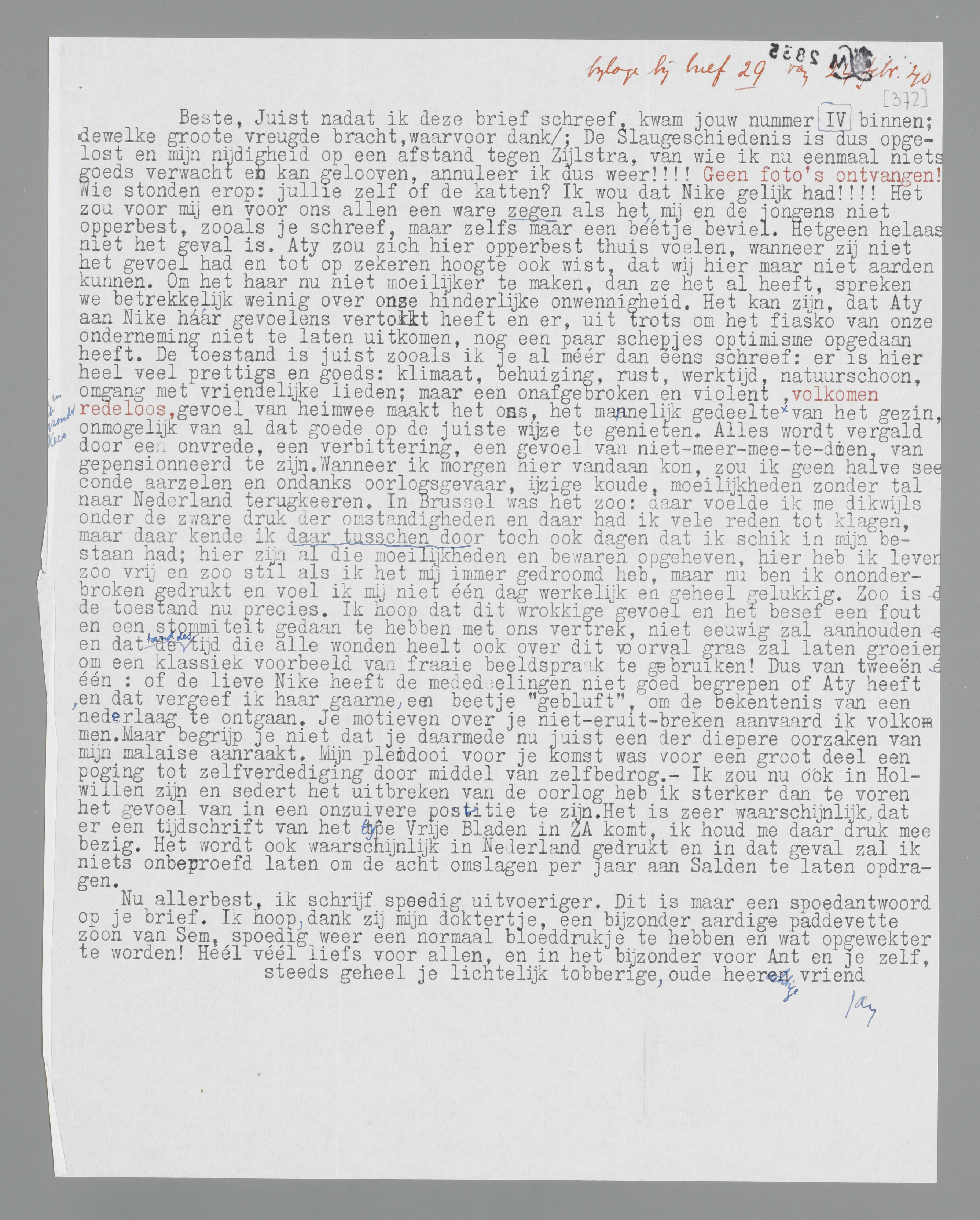 Beste, juist nadat ik deze brief schreef, kwam jouw nummer IV binnen; dewelke groote vreugde bracht, waarvoor dank; De Slaugeschiedenis is dus opgelost en mijn nijdigheid op een afstand van Zijlstra, van wie ik nu eenmaal niets goeds verwacht en kan gelooven, annuleer ik dus weer!!!! Geen foto's ontvangen! Wie stonden erop: jullie zelf of de katten? Ik wou dat Nike gelijk had!!!! Het zou voor mij en voor ons allen een ware zegen als het mij en de jongens niet opperbest, zooals je schreef, maar zelfs maar een béétje beviel. Hetgeen helaas niet het geval is. Aty zou zich hier opperbest thuis voelen, wanneer zij niet het gevoel had en tot op zekeren hoogte ook wist, dat wij hier maar niet aarden kunnen. Om het haar nu niet moeilijker te maken, dan ze het al heeft, spreken we betrekkelijk weinig over onze hinderlijke onwennigheid. Het kan zijn, dat Aty aan Nike háár gevoelens vertolkt heeft en er, uit trots om het fiasko van onze onderneming niet te laten uitkomen, nog een paar schepjes optimisme opgedaan heeft. De toestand is juist zooals ik je al méér dan eens schreef: er is hier heel veel prettigs en goeds: klimaat, behuizing, rust, werktijd, natuurschoon, omgang met vriendelijke lieden; maar een onafgebroken en violent, volkomen redeloos, gevoel van heimwee maakt het ons, het mannelijk gedeelte <en in het bijzonder Kees> van het gezin, onmogelijk van al dat goede op de juiste wijze te genieten. Alles wordt vergald door een onvrede, een verbittering, een gevoel van niet-meer-mee-te-doen, van gepensionneerd te zijn. Wanneer ik morgen hier vandaan kon, zou ik geen halve seconde aarzelen en ondanks oorlogsgevaar, ijzige koude, moeilijkheden zonder tal naar Nederland terugkeeren. In Brussel was het zoo: daar voelde ik me dikwijls onder de zware druk der omstandigheden en daar had ik vele reden tot klagen, maar daar kende ik daar tusschen door toch ook dagen dat ik schik in mijn bestaan had; hier zijn al die moeilijkheden en bezwaren opgeheven, hier heb ik leven zoo vrij en zoo stil als ik het mij immer gedroomd heb, maar nu ben ik ononderbroken gedrukt en voel ik mijn niet één dag werkelijk en geheel gelukkig. Zoo is de toestand nu precies. Ik hoop dat dit wrokkige gevoel en het besef een fout en een stommiteit gedaan te hebben met ons vertrek, niet eeuwig zal aanhouden en dat de <tand des> tijd die alle wonden heelt ook over dit voorval gras zal laten groeien om een klassiek voorbeeld van fraaie beeldspraak te gebruiken! Dus van tweeën één: of de lieve Nike heeft de mededeelingen niet goed begrepen of Aty heeft, en dat vergeef ik haar gaarne, een beetje ‘gebluft’, om de bekentenis van een nederlaag te ontgaan. Je motieven over je niet-eruit-breken aanvaard ik volkomen. Maar begrijp je niet dat je daarmede nu juist een der diepere oorzaken van mijn malaise aanraakt. Mijn pleidooi voor je komst was voor een groot deel een poging tot zelfverdediging door middel van zelfbedrog.- Ik zou nu ook in Holland willen zijn en sedert het uitbreken van de oorlog heb ik sterker dan te voren het gevoel van in een onzuivere positie te zijn. Het is zeer waarschijnlijk, dat er een tijdschrift van het type Vrije Bladen in ZA komt, ik houd me daar druk mee bezig. Het wordt ook waarschijnlijk in Nederland gedrukt en in dat geval zal ik niets onbeproefd laten om de acht omslagen per jaar aan Salden te laten opdragen.