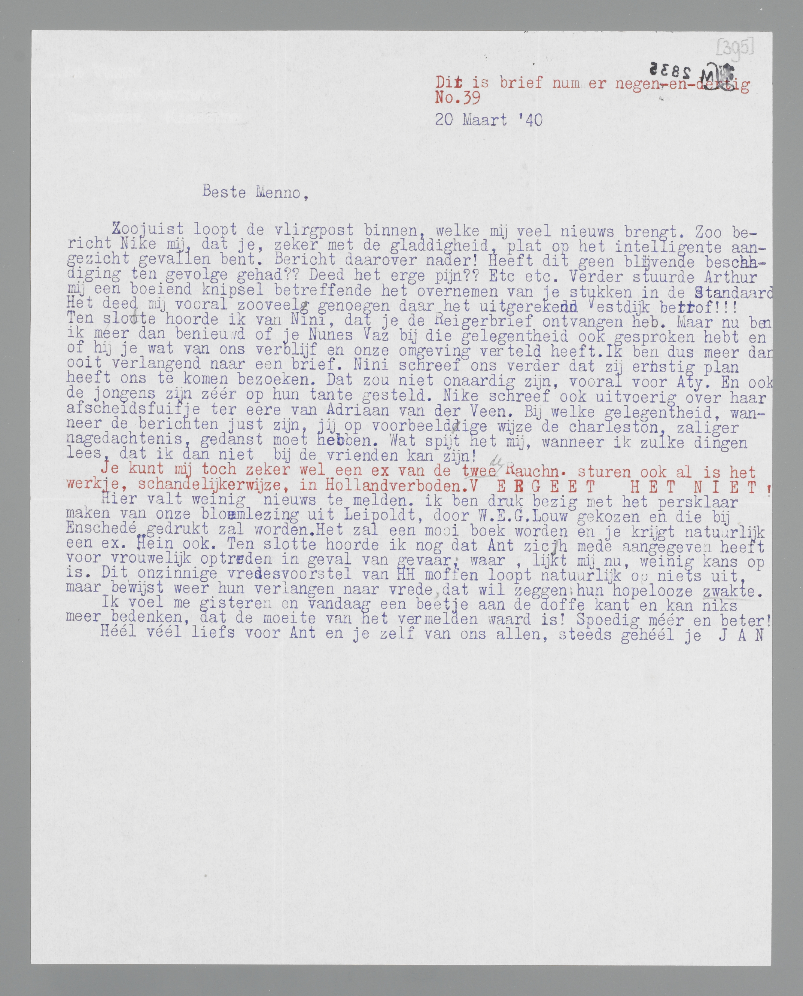 Zoojuist loopt de vliegpost binnen, welke mij veel nieuws brengt. Zoo bericht Nike mij, dat je, zeker met de gladdigheid, plat op het intelligente aangezicht gevallen bent. Bericht daarover nader! Heeft dit geen blijvende beschadiging ten gevolge gehad?? Deed het erge pijn?? Etc etc. Verder stuurde Arthur mij een boeiend knipsel betreffende het overnemen van je stukken in de Standaard. Het deed mij vooral zooveel genoegen daar het uitgerekend Vestdijk betrof!!!