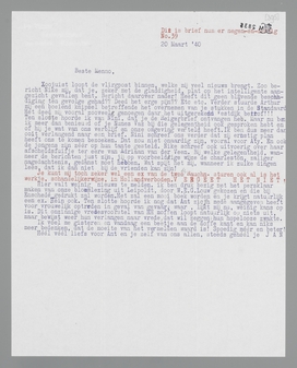 Hier valt weinig nieuws te melden. ik ben druk bezig met het persklaar maken van onze bloemlezing uit Leipoldt, door W.E.G. Louw gekozen en die bij Enschedé gedrukt zal worden. Het zal een mooi boek worden en je krijgt natuurlijk een ex. Hein ook. Ten slotte hoorde ik nog dat Ant zich mede aangegeven heeft voor vrouwelijk optreden in geval van gevaar: waar, lijkt mij nu, weinig kans op is. Dit onzinnige vredesvoorstel van HH moffen loopt natuurlijk op niets uit, maar bewijst weer hun verlangen naar vrede, dat wil zeggen: hun hopelooze zwakte.
