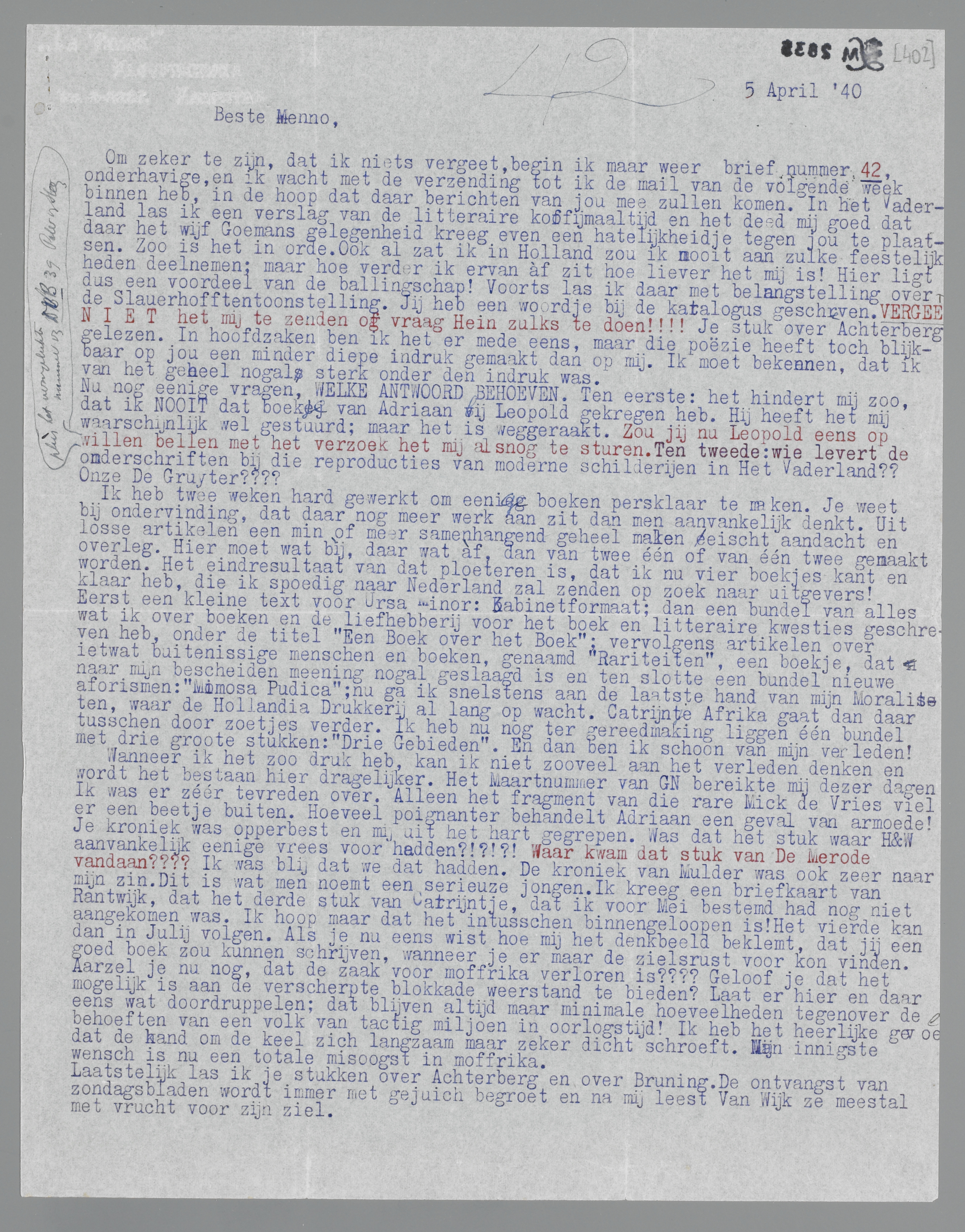 Om zeker te zijn, dat ik niets vergeet, begin ik maar weer brief nummer 42, onderhavige, en ik wacht met de verzending tot ik de mail van de volgende week binnen heb, in de hoop dat daar berichten van jou mee zullen komen. In het Vaderland las ik een verslag van de litteraire koffijmaaltijd en het deed mij goed dat daar het wijf Goemans gelegenheid kreeg even een hatelijkheidje tegen jou te plaatsen. Zoo is het in orde. Ook al zat ik in Holland zou ik nooit aan zulke feestelijkheden deelnemen; maar hoe verder ik ervan àf zit, hoe liever het mij is! Hier ligt dus een voordeel van de ballingschap! Voorts las ik daar met belangstelling over de Slauerhofftentoonstelling. Jij hebt een woordje bij de katalogus geschreven. VERGEET NIET het mij te zenden of vraag Hein zulks te doen!!!! Je stuk over Achterberg gelezen. In hoofdzaken ben ik het er mede eens, maar die poëzie heeft toch blijkbaar op jou een minder diepe indruk gemaakt dan op mij. Ik moet bekennen, dat ik van het geheel nogal sterk onder den indruk was.