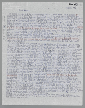 Nu nog eenige vragen, WELKE ANTWOORD BEHOEVEN. Ten eerste: het hindert mij zoo, dat ik nooit dat boekje van Adriaan bij Leopold gekregen heb. Hij heeft het mij waarschijnlijk wel gestuurd; maar het is weggeraakt. Zou jij nu Leopold eens op willen bellen met het verzoek het mij alsnog te sturen. Plús het verongelukte nummer v. DVB-'39 Peter van Steen. Ten tweede: wie levert de onderschriften bij die reproducties van moderne schilderijen in Het Vaderland?? Onze De Gruyter????