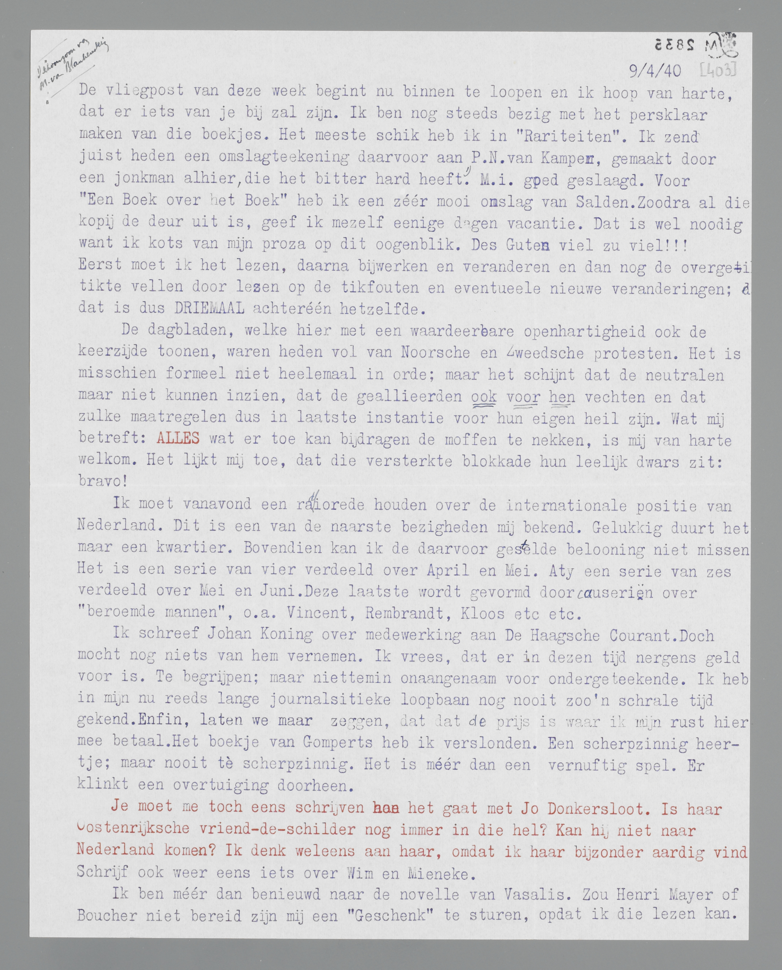 Toen ik je gisterenochtend héél in de vroegte schreef, kon ik niet vermoeden, dat het van god verlaten moffentuig weer een nieuwe ellendige smeerlapperij op touw gezet had. Ik was gisteren verder net zoo ter neer geslagen als de dag waarop ze Oostenrijk binnendrongen. Ik deed den heelen dag niets, alleen moest ik 's avonds voor de radio spreken over Nederland als cultuurcentrum. Daarnà zaten we met Van Wijk aan zee. Hij was al even verslagen. Kortom een verbitterde rotdag.