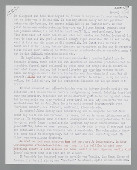 Vandaag een brief van Simon van 25 Maart, zeer vlug dus en een ex van het geschenk, dat er vies uitziet. Maar de novelle van Vasalis is inderdaad excellent met een geheel eigen toon. Voortreffelijk. Ik wou dat je haar wist te bewegen er zoo eenige voor GN te schrijven, dat zou een groote aanwinst zijn!!! Vergeet NIET haar uit mijn naam te porren. Zeg haar dan tevens, met het oog op een eventueele herdruk in een bundel dat een Française nooit ‘fiche-t'en’ zou zeggen, omdat dit geen Fransch is. Ik ben in lang niet zoo in mijn schik geweest met een Nederlandsche novelle. De stemming is prachtig, de toon volmaakt en ze heeft een zéér eigen en treffend woordgebruik.