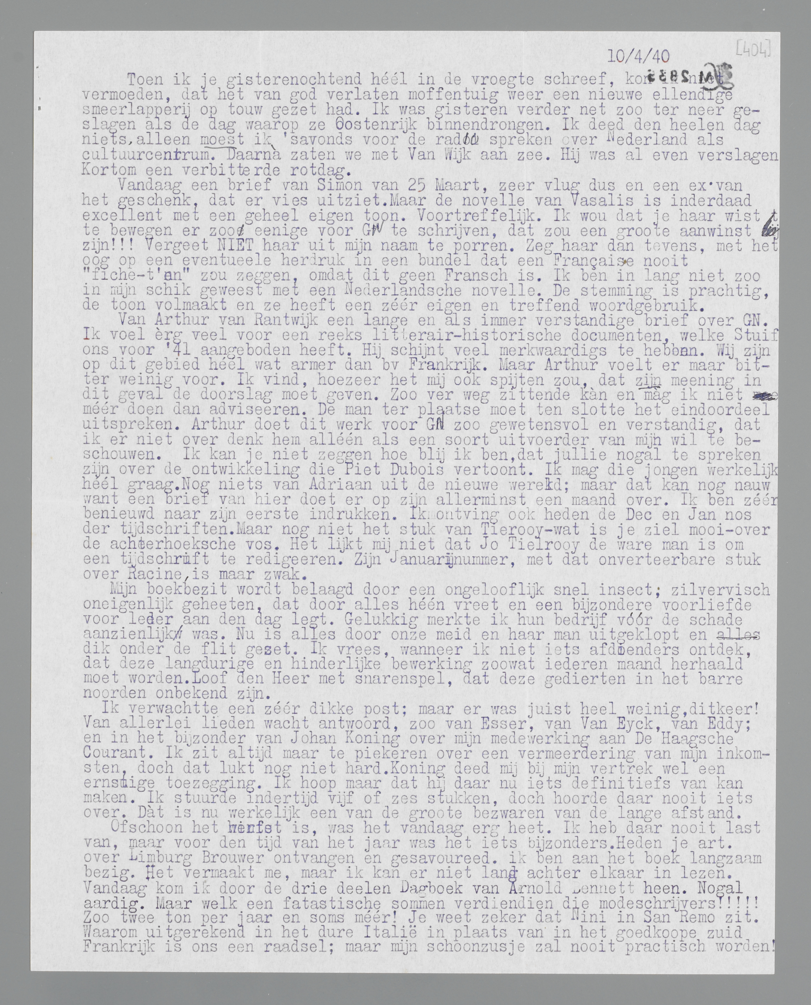 Van Arthur van Rantwijk een lange en als immer verstandige brief over GN. Ik voel èrg veel voor een reeks litterair-historische documenten, welke Stuif ons voor '41 aangeboden heeft. Hij schijnt veel merkwaardigs te hebben. Wij zijn op dit gebied héél wat armer dan bv. Frankrijk. Maar Arthur voelt er maar bitter weinig voor. Ik vind, hoezeer het mij ook spijten zou, dat zijn mening in dit geval de doorslag moet geven. Zoo ver weg zittende kàn en màg ik niet méér doen dan adviseren. De man ter plaatse moet ten slotte het eindoordeel uitspreken. Arthur doet dit werk voor GN zoo gewetensvol en verstandig, dat ik er niet over denk hem alléén als een soort uitvoerder van mijn wil te beschouwen. Ik kan je niet zeggen hoe blij ik ben, dat jullie nogal te spreken zijn over de ontwikkeling die Piet Dubois vertoont. Ik mag die jongen werkelijk héél graag. Nog niets van Adriaan uit de nieuwe wereld; maar dat kan nog nauw want een brief van hier doet er op zijn allerminst een maand over. Ik ben zéér benieuwd naar zijn eerste indrukken. Ik ontving ook heden de Dec en Jan nos der tijdschriften. Maar nog niet het stuk van Tierooy-wat is je ziel mooi-over de achterhoeksche vos. Het lijkt mij niet dat Jo Tielrooy de ware man is om een tijdschrift te redigeeren. Zijn Januarijnummer, met dat onverteerbare stuk over Racine is maar zwak.