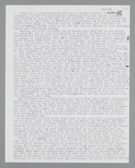 Wanneer ik het zoo druk heb, kan ik niet zooveel aan het verleden denken en wordt het bestaan hier dragelijker. Het Maartnummer van GN bereikte mij dezer dagen. Ik was er zéér tevreden over. Alleen het fragment van die rare Mick de Vries viel er een beetje buiten. Hoeveel poignanter behandelt Adriaan een geval van armoede! Je kroniek was opperbest en mij uit het hart gegrepen. Was dat het stuk waar H&W aanvankelijk eenige vrees voor hadden?!?!?! Waar kwam dat stuk van De Merode vandaan???? Ik was blij dat we dat hadden. De kroniek van Mulder was ook zeer naar mijn zin. Dit is wat men noemt een serieuze jongen. Ik kreeg een briefkaart van Rantwijk, dat het derde stuk van Catrijntje, dat ik voor Mei bestemd had nog niet aangekomen was. Ik hoop maar dat het intusschen binnengeloopen is! Het vierde kan dan in Julij volgen. Als je nu eens wist hoe mij het denkbeeld beklemt, dat jij een goed boek zou kunnen schrijven, wanneer je er maar de zielsrust voor kon vinden. Aarzel je nu nog, dat de zaak voor moffrika verloren is???? Geloof je dat het mogelijk is aan de verscherpte blokkade weerstand te bieden? Laat er hier en daar eens wat doordruppelen; dat blijven altijd maar minimale hoeveelheden tegenover de behoeften van een volk van tachtig miljoen in oorlogstijd! Ik heb het heerlijke gevoel dat de hand om de keel zich langzaam maar zeker dicht schroeft. Mijn innigste wensch is nu een totale misoogst in moffrika.