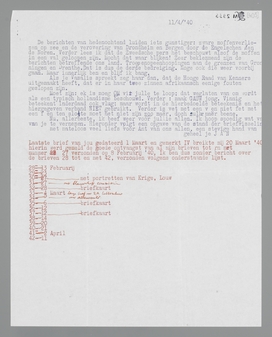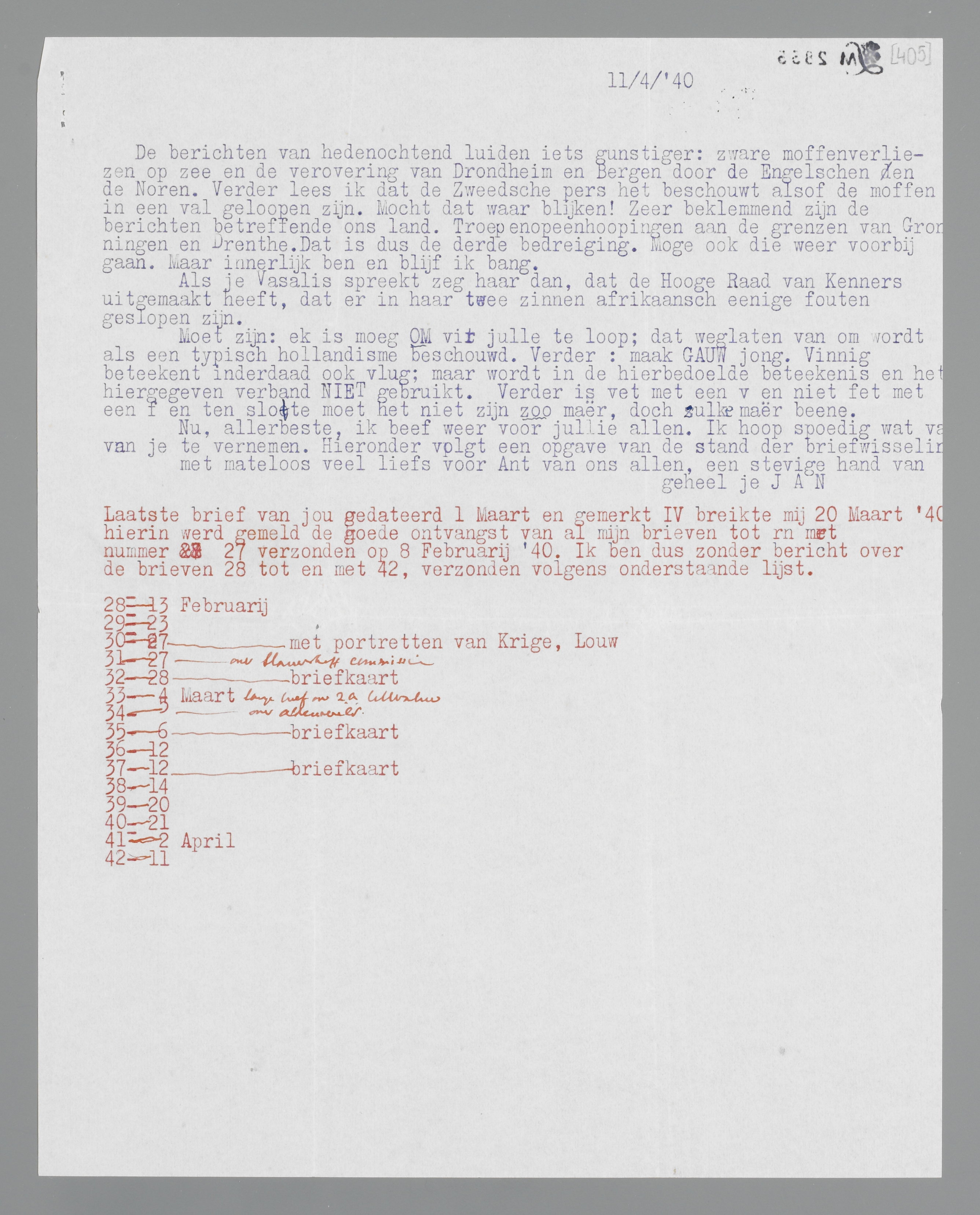 Laatste brief van jou gedateerd 1 Maart en gemerkt IV bereikte mij 20 Maart '40. Hierin werd gemeld de goede ontvangst van al mijn brieven tot rn met nummer 27 verzonden op 8 Februarij '40. Ik ben dus zonder bericht over de brieven 28 tot en met 42, verzonden volgens onderstaande lijst.