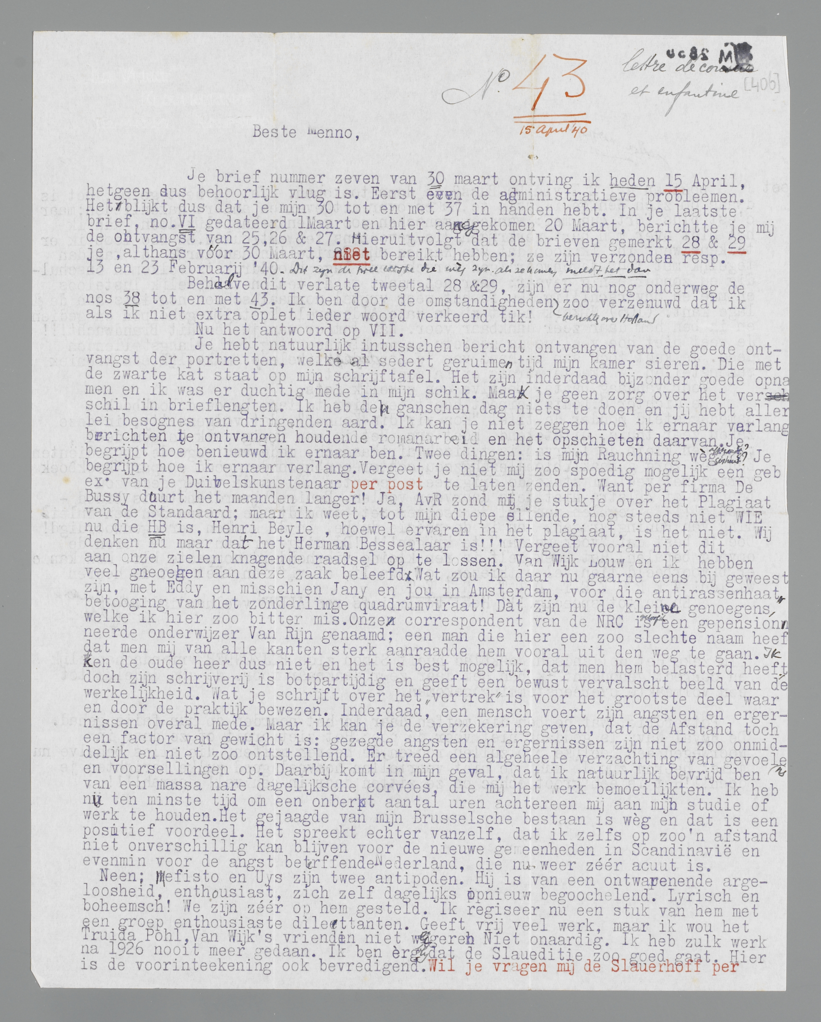 Je brief nummer zeven van 30 maart ontving ik heden 15 April, hetgeen dus behoorlijk vlug is. Eerst even de administratieve probleemen. Het blijkt dus dat je mijn 30 tot en met 37 in handen hebt. In je laatste brief, no. VI gedateerd 1 Maart en hier aangekomen 20 maart, berichtte je mij de ontvangst van 25, 26 & 27. Hieruit volgt dat de brieven gemerkt 28 & 29 je, althans vóór 30 Maart, niet bereikt hebben; ze zijn verzonden resp. 13 en 23 Februarij '40. <Dit zijn de twee eerste die wèg zijn - als ze komen, meldt het dan.>