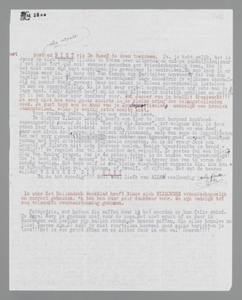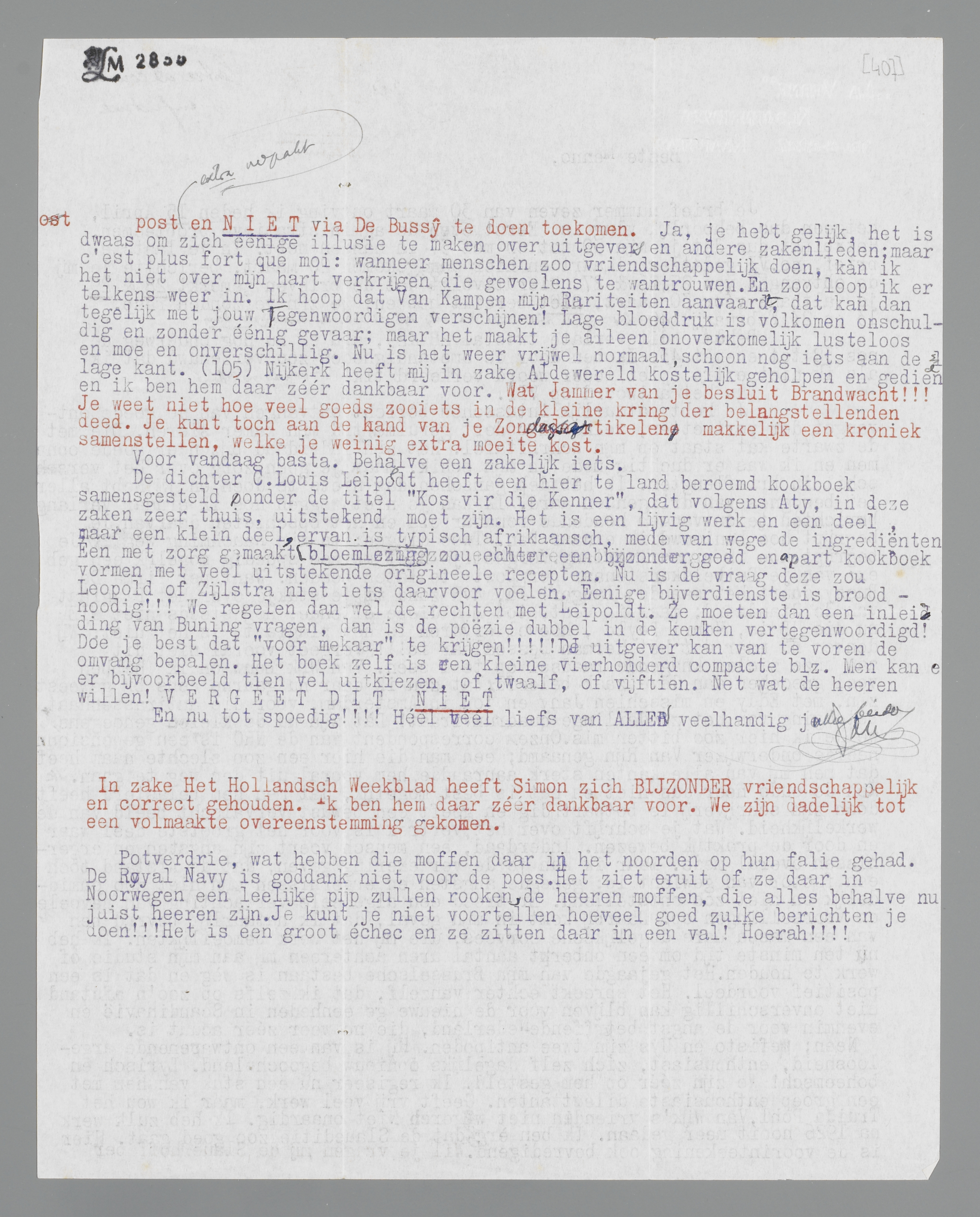 De dichter C. Louis Leipoldt heeft een hier te land beroemd kookboek samengesteld onder de titel ‘Kos vir die Kenner’, dat volgens Aty, in deze zaken zeer thuis, uitstekend moet zijn. Het is een lijvig werk en een deel, maar een klein deel, ervan is typisch afrikaansch, mede vanwege de ingrediënten. Een met zorg gemaakte bloemlezing zou echter een bijzonder goed en apart kookboek vormen met veel uitstekende origineele recepten. Nu is de vraag deze zou Leopold of Zijlstra niet iets daarvoor voelen. Eenige bijverdienste is broodnoodig!!! We regelen dan wel de rechten met Leipoldt. Ze moeten dan een inleiding van Buning vragen, dan is de poëzie dubbel in de keuken vertegenwoordigd! Doe je best dat ‘voor mekaar’ te krijgen!!!!! De uitgever kan van te voren de omvang bepalen. Het boek zelf is een kleine vierhonderd compacte blz. Men kan er bijvoorbeeld tien vel uitkiezen, of twaalf, of vijftien. Net wat de heeren willen! VERGEET DIT NIET