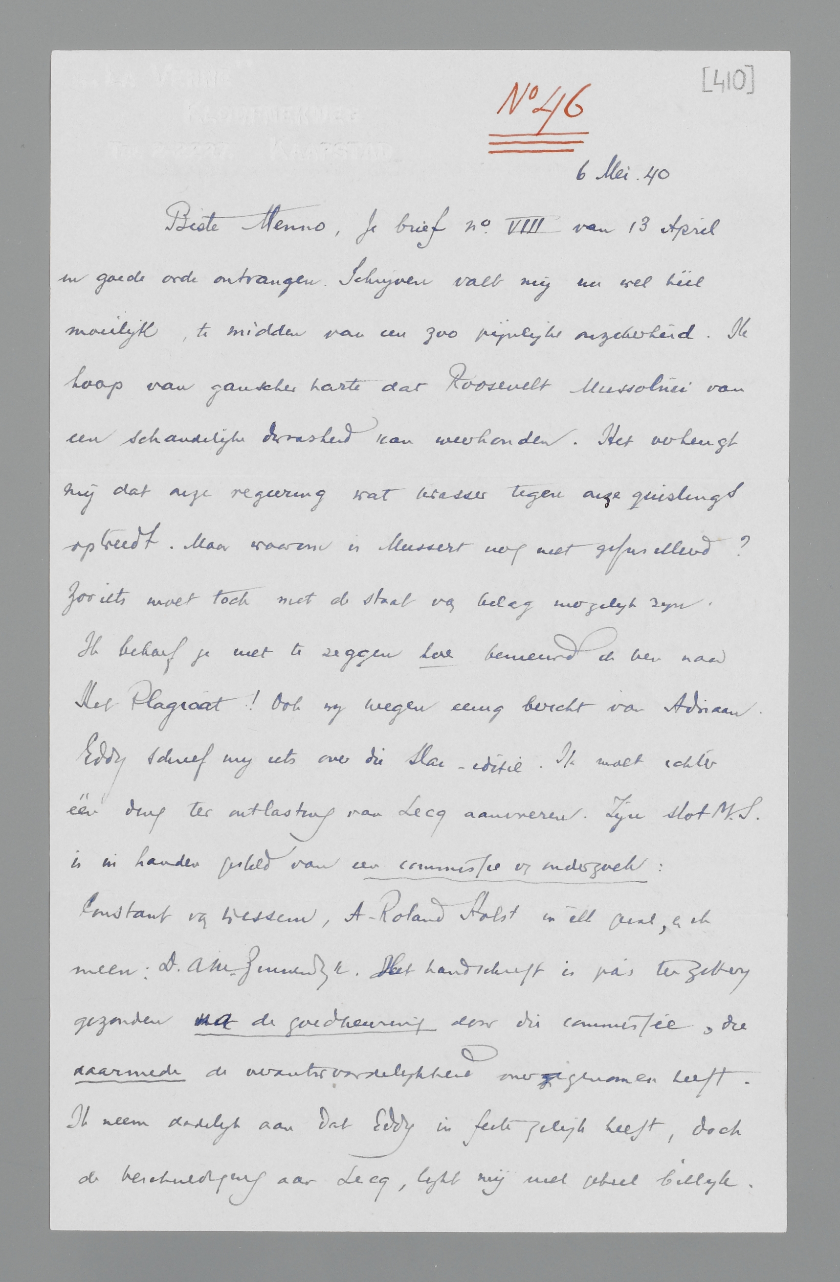 Je brief no. VIII van 13 April in goede orde ontvangen. Schrijven valt mij nu wel héél moeilijk, te midden van een zoo pijnlijke onzekerheid. Ik hoop van ganser harte dat Roosevelt Mussolini van een schandelijke dwaasheid kan weerhouden. Het verheugt mij dat onze regering wat krasser tegen onze quislings optreedt. Maar waarom is Mussert nog niet gefusilleerd? Zoiets moet toch met de staat van beleg mogelijk zijn. Ik behoef je niet te zeggen hoe benieuwd ik ben naar Het Plagiaat! Ook wij kregen eenig bericht van Adriaan. Eddy schreef mij iets over die Slau-editie. Ik moet echter één ding ter ontlasting van Lecq aanvoeren. Zijn slot M.S. is in handen gelegd van een commissie van onderzoek: