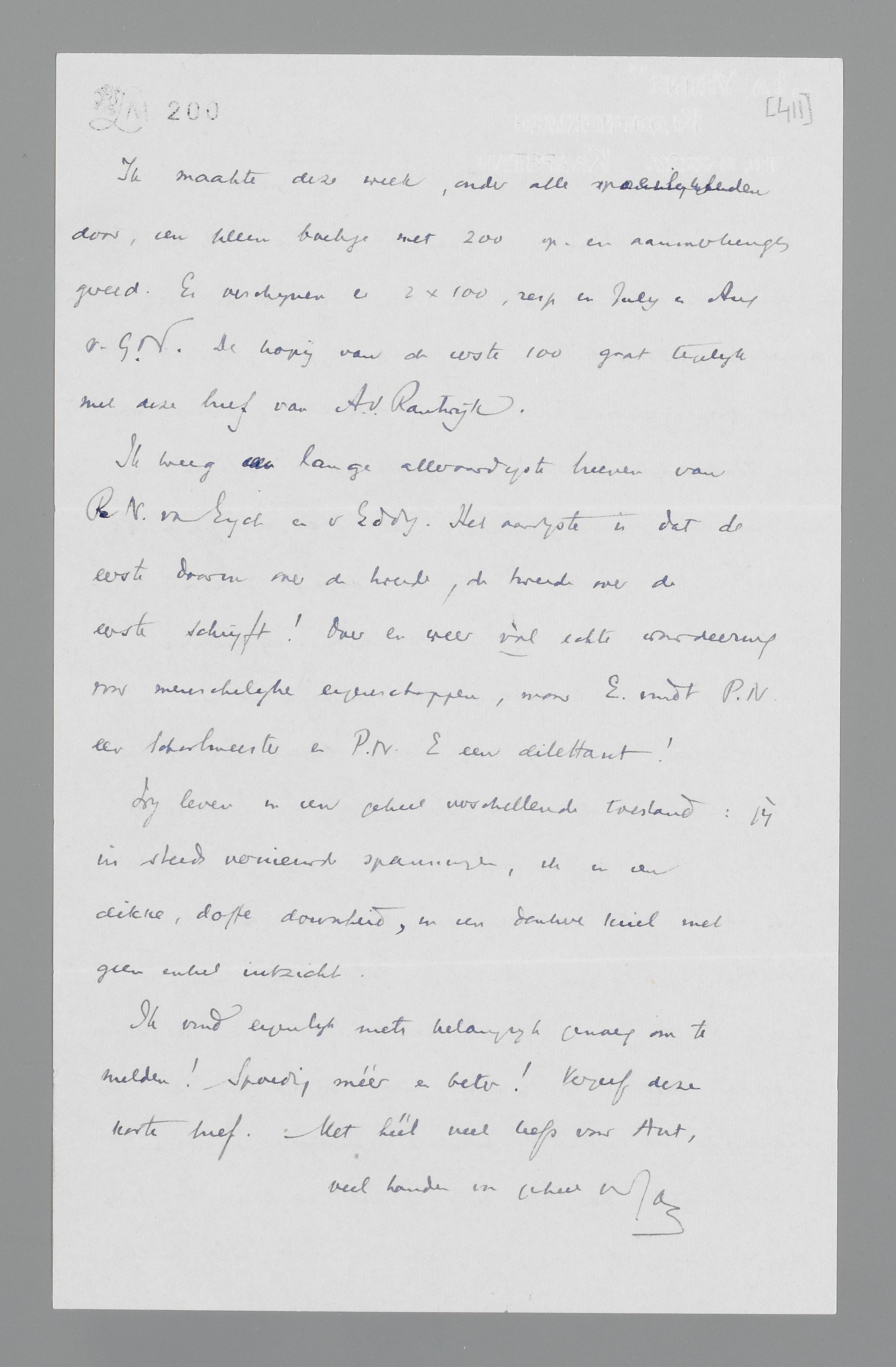 Ik kreeg lang alleraardigste brieven van P.N. van Eyck en van Eddy. Het aardigste is dat de eerste daarin over de tweede, de tweede over de eerste schrijft! Over en weer vol echte waardering voor menselijke eigenschappen, maar E. vindt P.N. een schoolmeester en P.N.E. een dilettant!