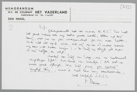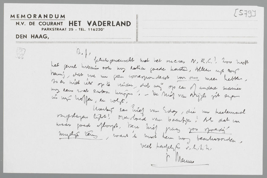 Geluk gewenscht met het succes N.R.C.! Zoo heeft het geval Urbain ook nog enkele goede kanten. Alleen zijn wij treurig, dat wij nu geen correspondent voor ons meer hebben. Is er niet iets op te vinden, dat wij op een of andere manier nog eens wat extra krijgen? - De brief van Nijgh zit ergens in mijn koffer, en volgt.