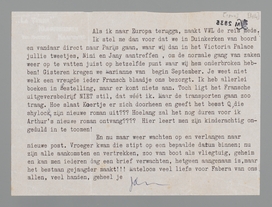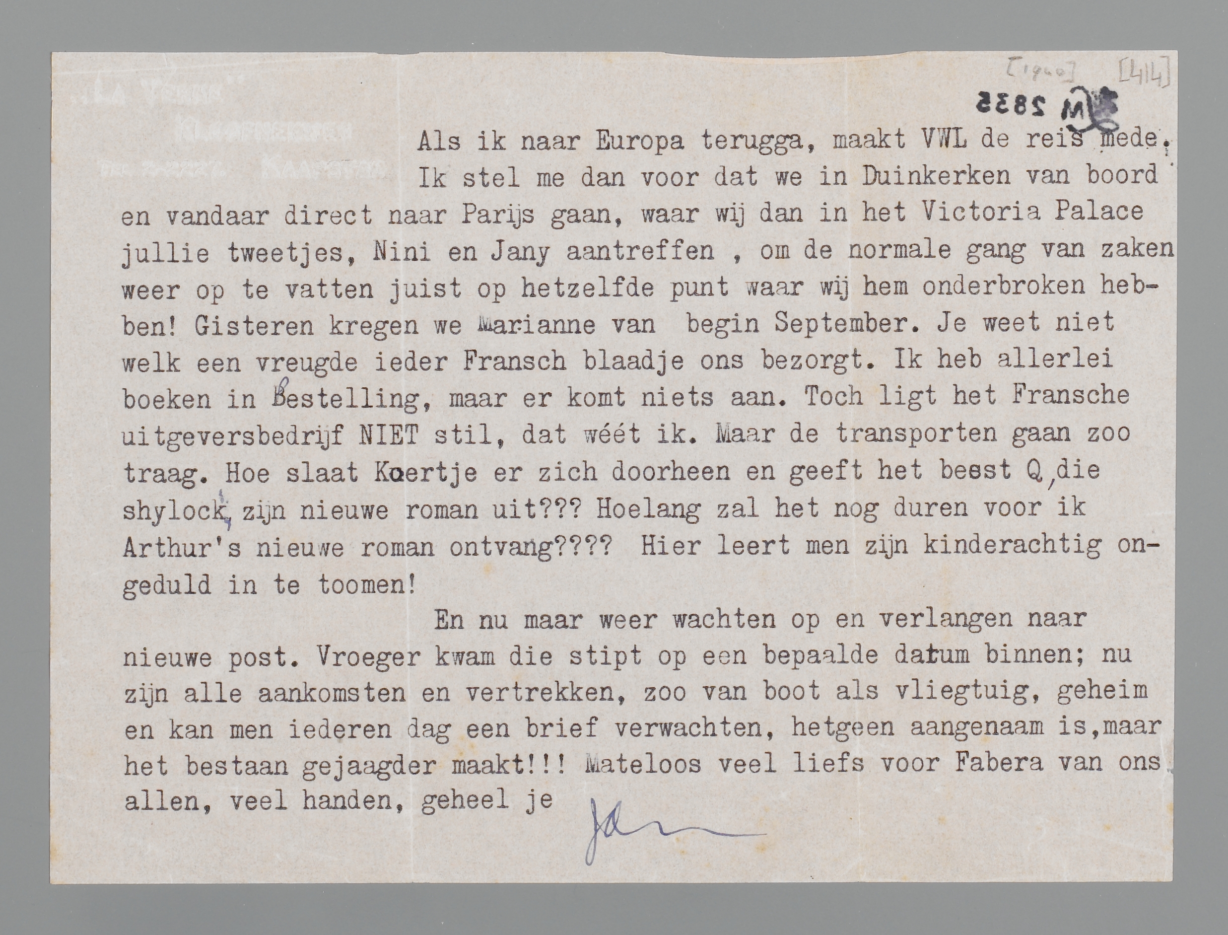 Als ik naar Europa terugga, maakt VWL de reis mede. Ik stel me dan voor dat we in Duinkerken van boord en vandaar direct naar Parijs gaan, waar wij dan in het Victoria Palace jullie tweetjes, Nini en Jany aantreffen, om de normale gang van zaken weer op te vatten juist op hetzelfde punt waar wij hem onderbroken hebben! Gisteren kregen we Marianne van begin September. Je weet niet welk een vreugde ieder Fransch blaadje ons bezorgt. Ik heb allerlei boeken in bestelling, maar er komt niets aan. Toch ligt het Fransche uitgeversbedrijf NIET stil, dat wéét ik. Maar de transporten gaan zoo traag. Hoe slaat Koertje er zich doorheen en geeft het beest Q, die shylock, zijn nieuwe roman uit??? Hoelang zal het nog duren voor ik Arthur's nieuwe roman ontvang???? Hier leert men zijn kinderachtig ongeduld in te toomen!
