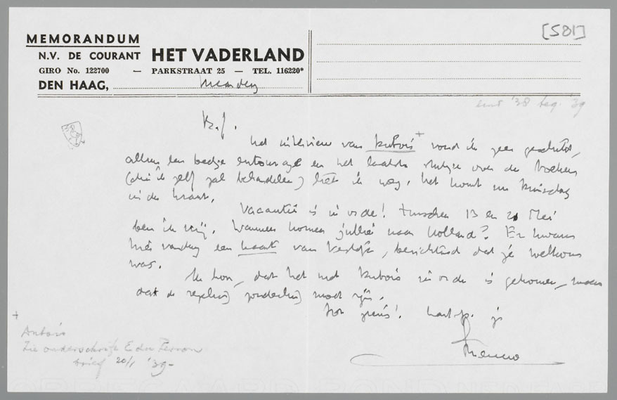 Vacantie is in orde! Tusschen 13 en 20 Mei ben ik vrij. Wanneer komen jullie naar Holland? Er kwam hier vandaag een kaart van Vestdijk, berichtend dat je welkom was.