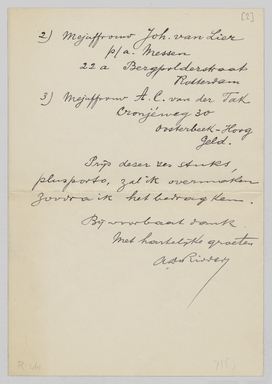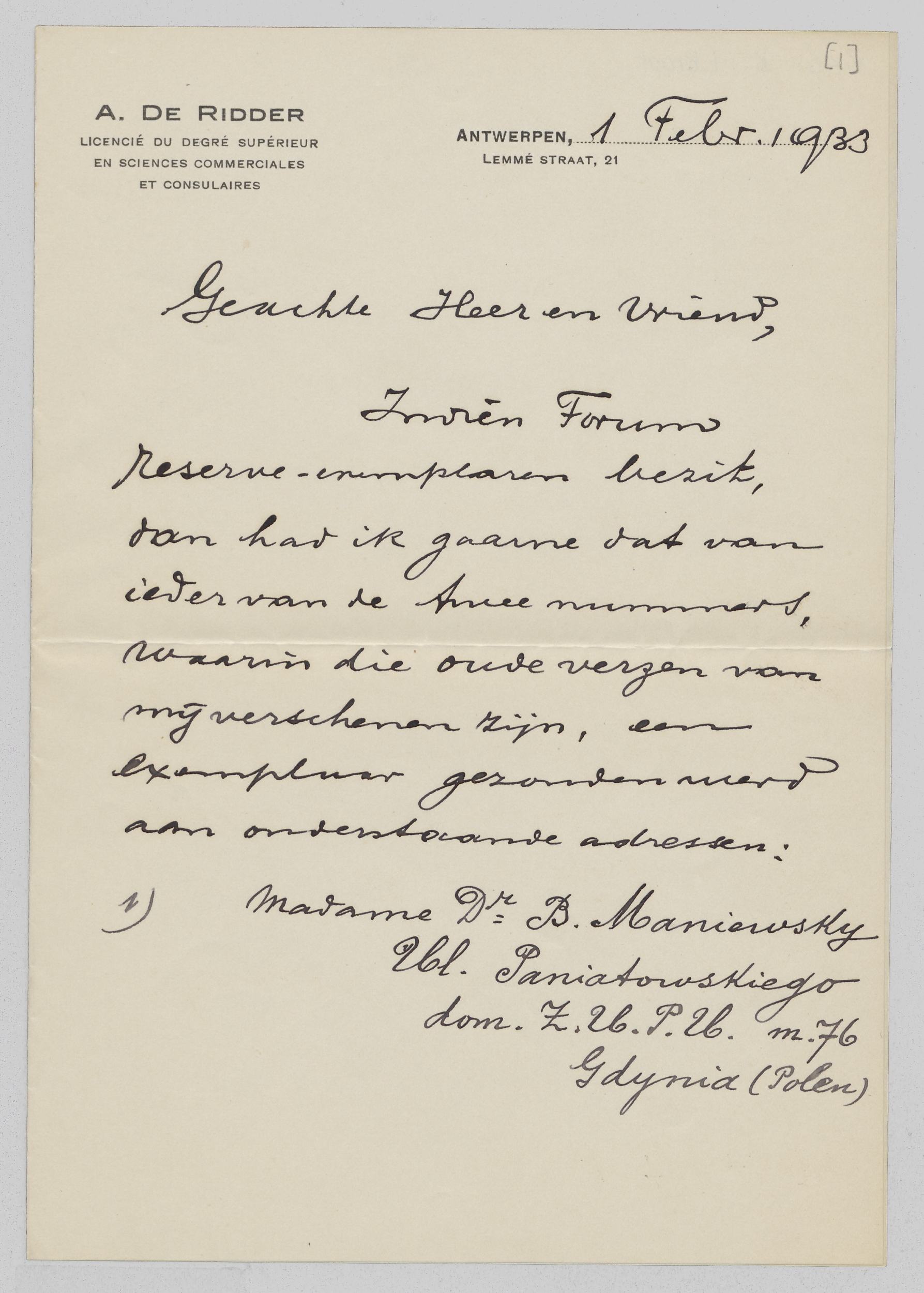 Indien Forum reserve-exemplaren bezit, dan had ik gaarne dat van ieder van de twee nummers, waarin die oude verzen van mij verschenen zijn, een exemplaar gezonden werd aan onderstaande adressen: