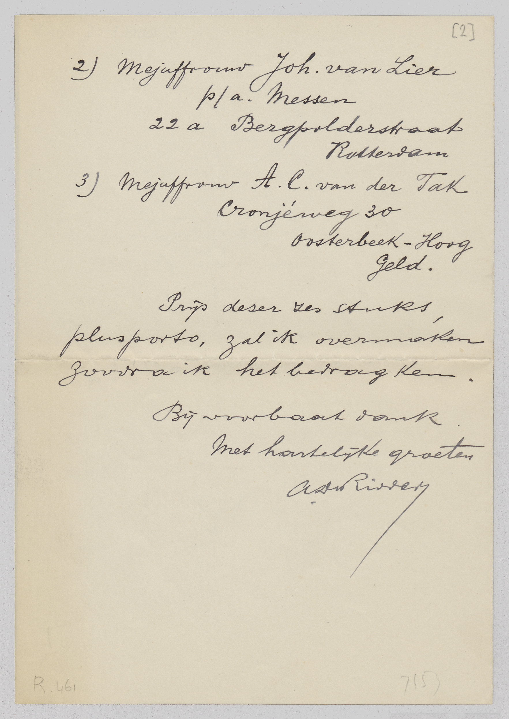 Prijs dezer zes stuks, plus porto, zal ik overmaken zoodra ik het bedrag ken.