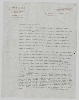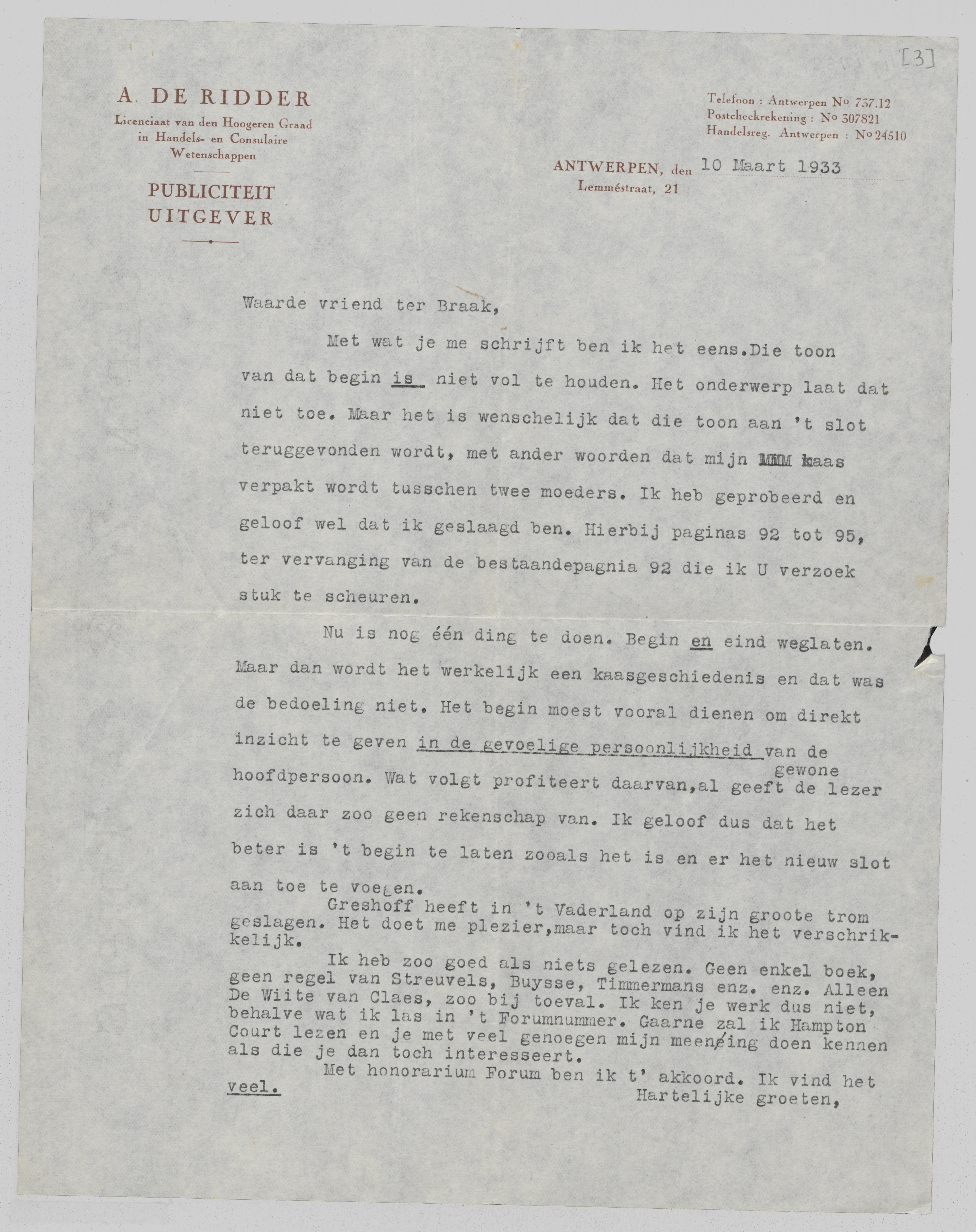 Met wat je me schrijft ben ik het eens. Die toon van dat begin is niet vol te houden. Het onderwerp laat dat niet toe. Maar het is wenschelijk dat die toon aan 't slot teruggevonden wordt, met andere woorden dat mijn kaas verpakt wordt tusschen twee moeders. Ik heb geprobeerd en geloof wel dat ik geslaagd ben. Hierbij paginas 92 tot 95, ter vervanging van de bestaande pagina 92 die ik U verzoek stuk te scheuren.